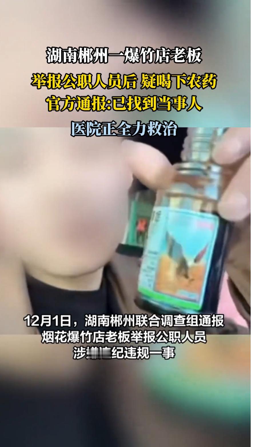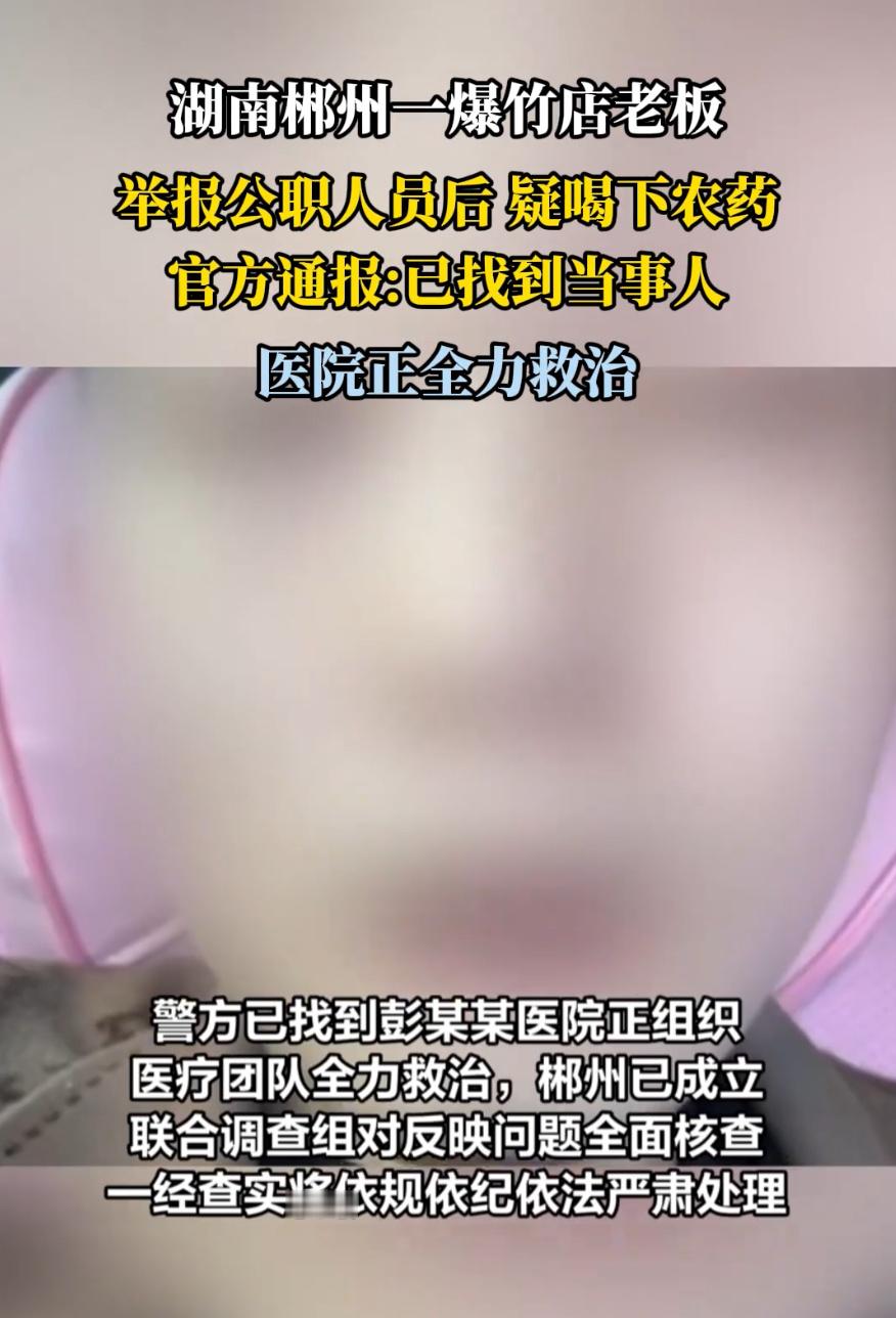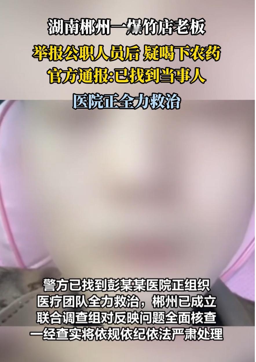 官方通报店主实名举报公职人员湖南郴州店主彭某某的极端选择,让人心痛又沉重。疑似因经营许可审批受阻、存货积压,他实名反映问题后,喝下剧毒农药以命相搏,目前正被全力抢救。