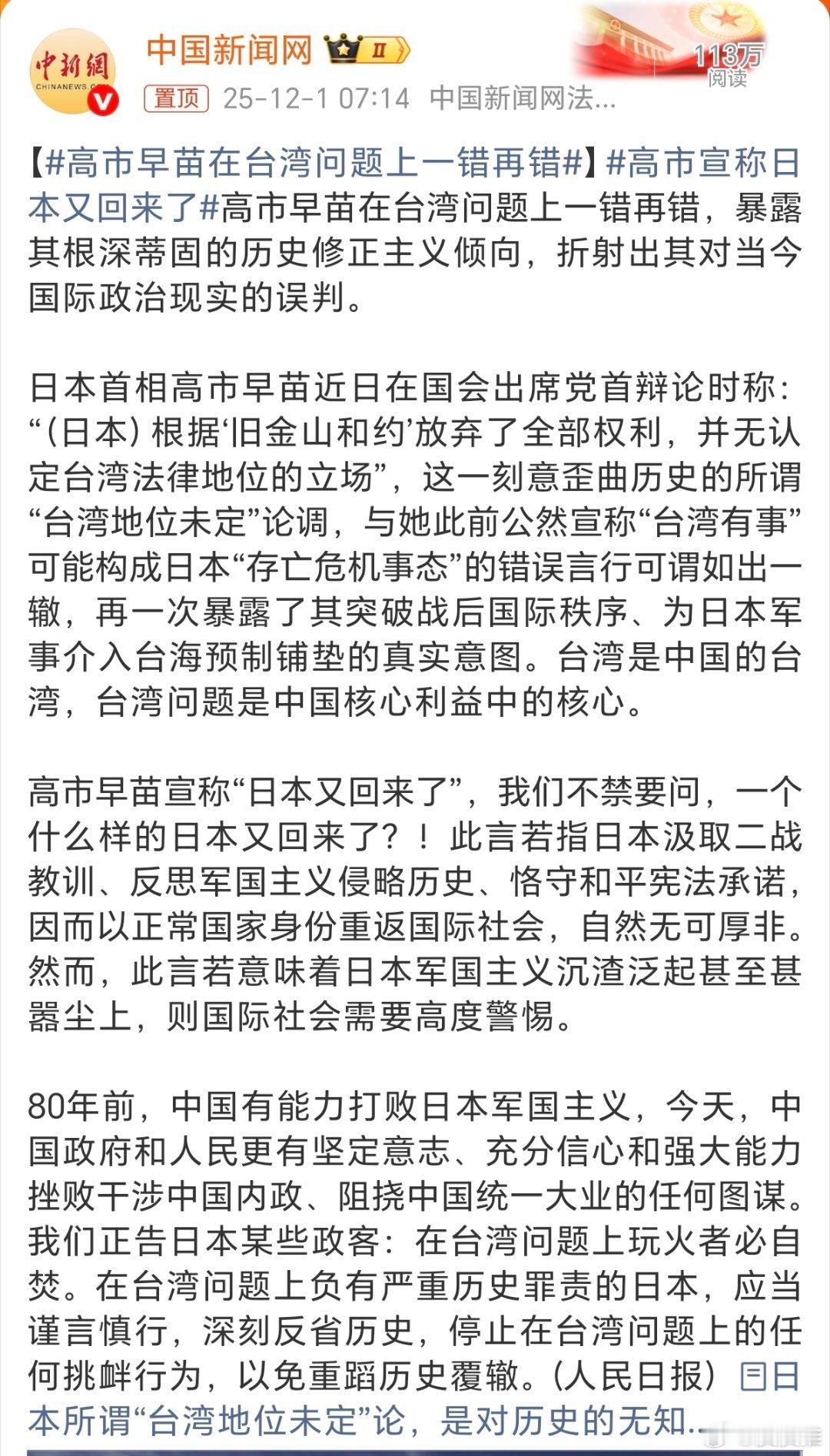 高市宣称日本又回来了日本军国主义幽灵招魂复活,会是全亚洲人民的灾难,高市早苗之流如果继续玩火自焚,必将成为历史的罪人!