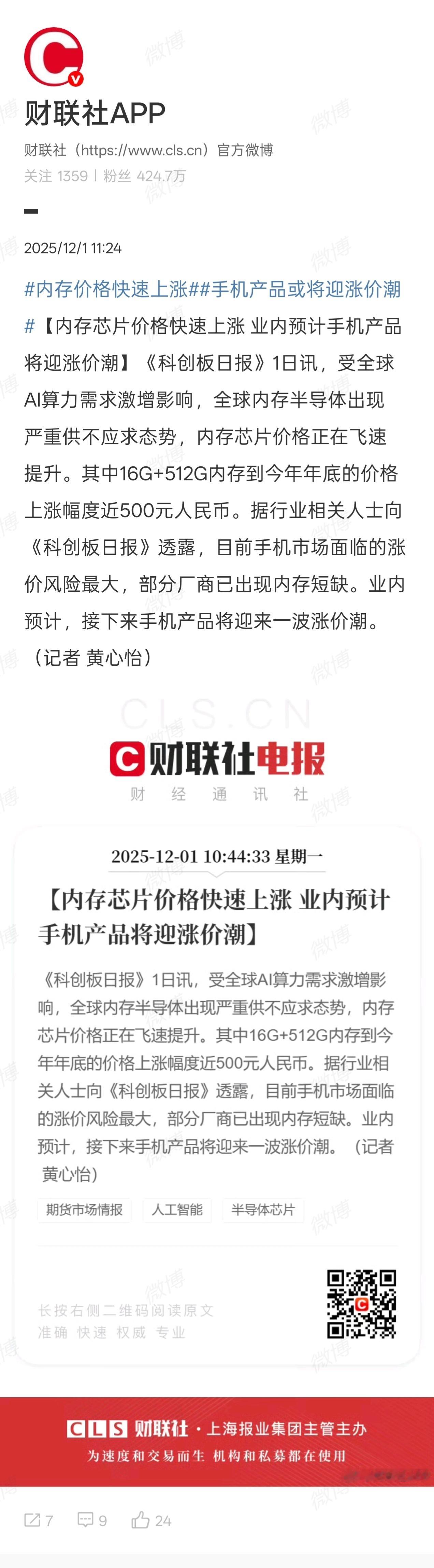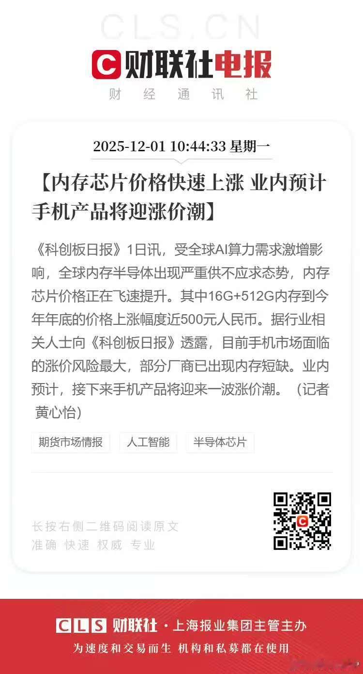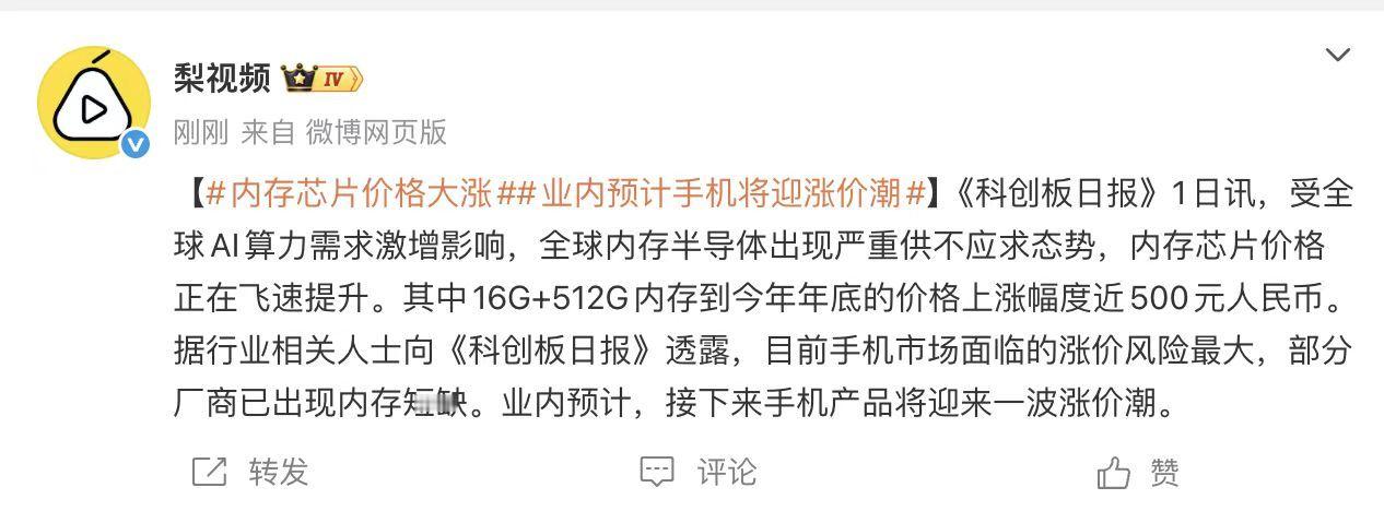 业内预计手机将迎涨价潮 上个月就有手机品牌的朋友跟我说明年2000到3000元价位的手机可能要贵个500元,现在更是提前了?年底就开始涨……这一波,品牌和消费者都难啊。