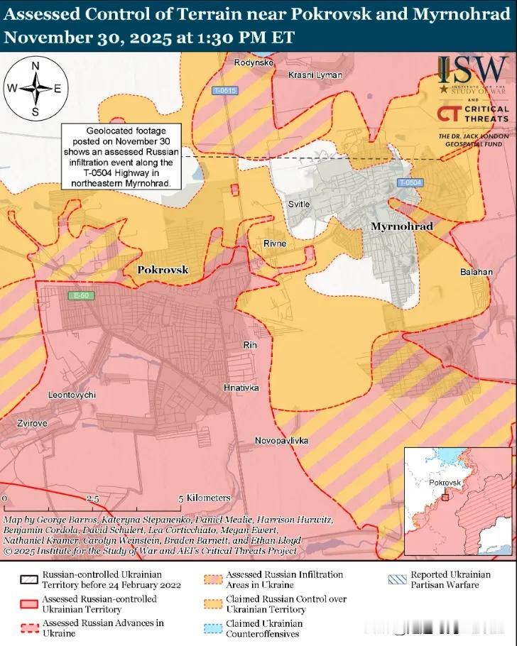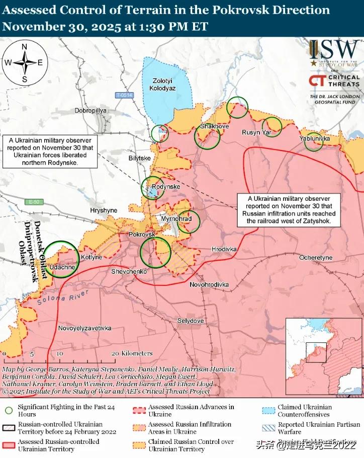 聚焦波克罗夫斯克!尽管俄军已渗透,但未能攻占该市 ; ISW评估 俄军正缓慢推进至波克罗夫斯克,付出极其沉重的损失。然而,尽管占领者在该市驻扎时间较长,但俄罗斯并尚未完全占领该城市。 参与该方向攻势行动的俄军部队和编制已被削弱,乌克兰军队有时会将占领军从他们占领的阵地中逼退。波克罗夫斯克方向的形势,及其近期发展前景,美国战争研究所(ISW)分析报告。 波克罗夫斯克方向发生了什么? 分析人士指出,俄罗斯攻占波克罗夫斯克的努力,仍然漫长且代价高昂。ISW认为,俄军为阵地战优化,只能实现缓慢推进的关键原因之一。 文章指出,尽管占领军已在该市坚守阵地“超过120天”,但进展缓慢,未能完全占领波克罗夫斯克。 11月30日,乌克兰军事观察员马绍韦茨报告称,乌克兰军队在反击中将俄军击退至罗丁斯克南郊。他补充说,波克罗夫斯克地区的城市战斗行动,伴随着重大损失,削弱了俄罗斯第51联合兵种军(前“DPR”第一军团)的部分力量,迫使俄军指挥部,将波罗的海舰队相对精锐的第336海军陆战队步兵旅和太平洋舰队第155海军陆战队步兵旅的部队,从邻近的科斯季安季尼夫卡-德鲁日科夫卡战术区域,调往第51军在卡泽尼·托列茨河以西(波克罗夫斯克东北、多布罗皮利亚东南)及新科诺米奇内-米尔诺赫拉德(波克罗夫斯克东和北)方向。 马绍韦茨指出,俄军无法将装甲车辆转移至卡泽尼托列茨河以西的桥头堡。因此,俄军步兵被迫在桥头堡缺乏支援,进一步限制,俄军在波克罗夫斯克包围线东北“肩膀”的推进速度。 分析人士对11月29日和30日的录像进行了地理定位。他们记录到乌克兰军队对博伊基夫卡以东、潘基夫卡以南和新托列茨克以西(均位于多布罗皮利亚东南)的俄军架桥车辆和装甲战斗车辆的打击。这些打击是在俄罗斯装备试图,渡过卡泽尼托列茨河时实施的。 11月28日,一支乌克兰营在波克罗夫斯克方向作战的副营长表示,俄军并未充分利用其无人机和人力的数量优势,且俄军驻扎波克罗夫斯克,并非乌军撤离城市的理由。 11月30日,参与波克罗夫斯克方向防御的部队的发言人报告称,俄军派遣训练不足、刚招募的人员参加第一波攻击。而且只有在他们之后,训练有素的俄罗斯攻击机才会发动攻击。 目前,分析人士认为,波克罗夫斯克方向的局势很严重。 马绍韦茨坚信,俄罗斯在利曼以南(波克罗夫斯克东北部)及波克罗夫斯克与米尔诺赫拉德之间地区的存在,将迫使乌克兰军队从这两座城市中的最后一城撤退,以避免被米尔诺赫拉德包围。 乌克兰一个营在波克罗夫斯克方向作战的副营长表示,俄军至少控制了波克罗夫斯克的一半地区。他强调,俄罗斯军队在兵力上的优势将使乌克兰军队难以完全收复这些城市。 乌克兰旅在波克罗夫斯克方向作战的一位发言人表示,浓雾持续恶化了无人机侦察的能力。他补充说,俄罗斯军队正在使用FPV无人机、莫尔尼亚无人机及其他无人机切断乌克兰地面通信线路。 据ISW报道,乌克兰军队在诺沃帕夫利夫卡附近推进,占领者在科斯坦丁尼夫卡-德鲁日科夫卡地区及库皮扬斯克附近。