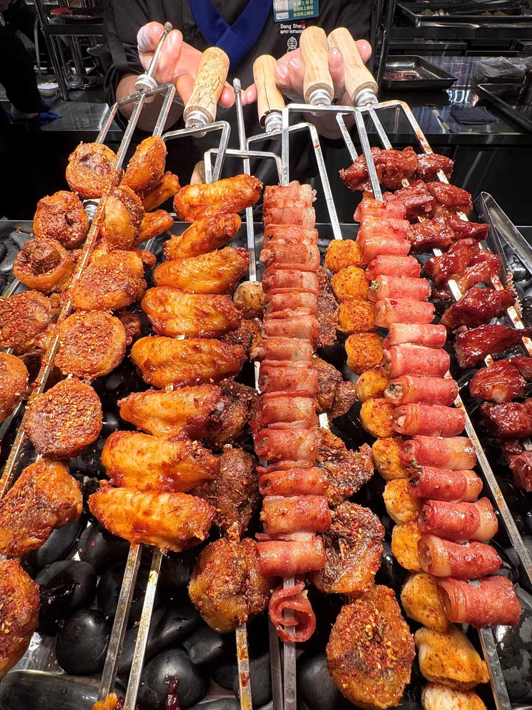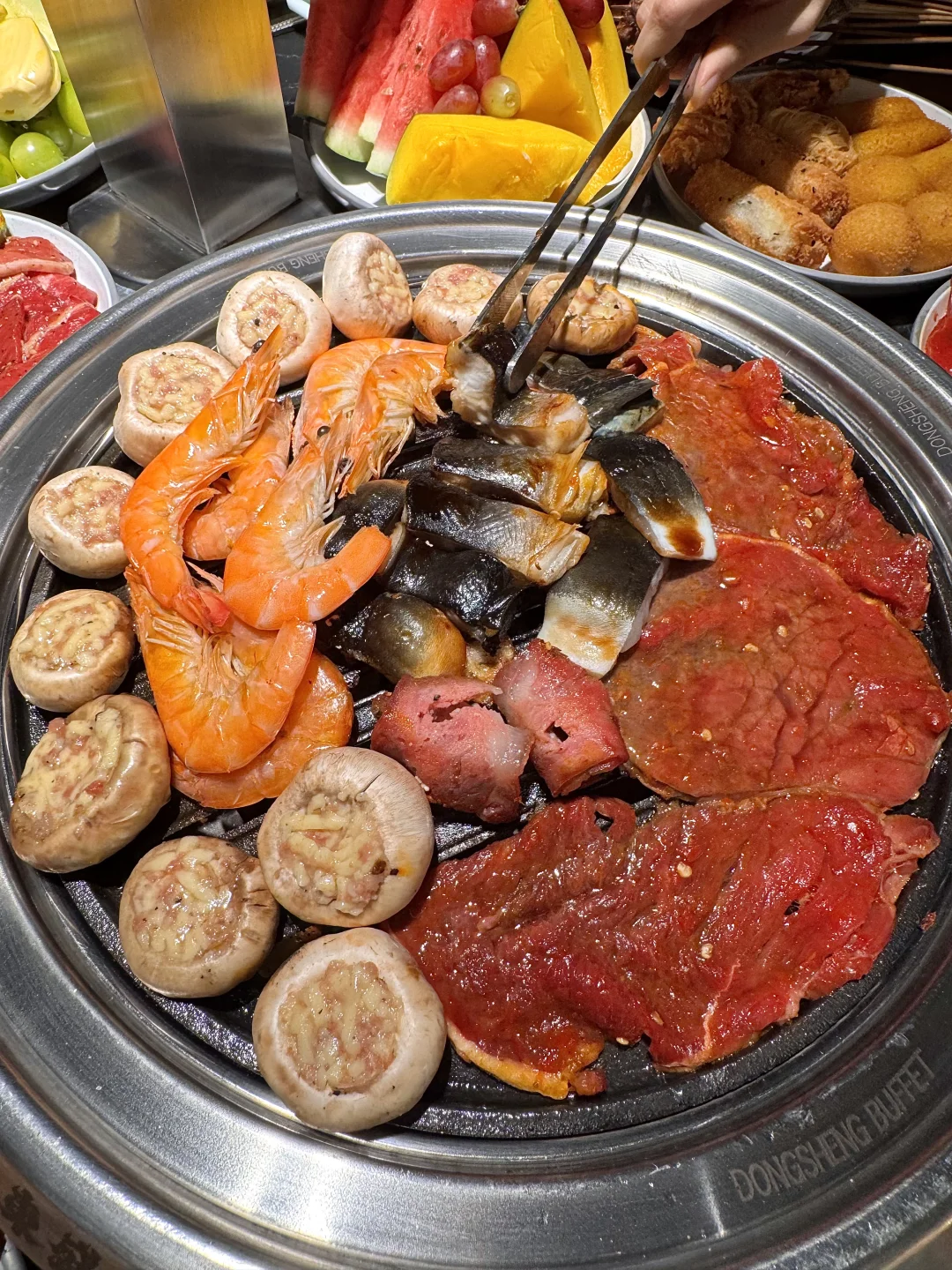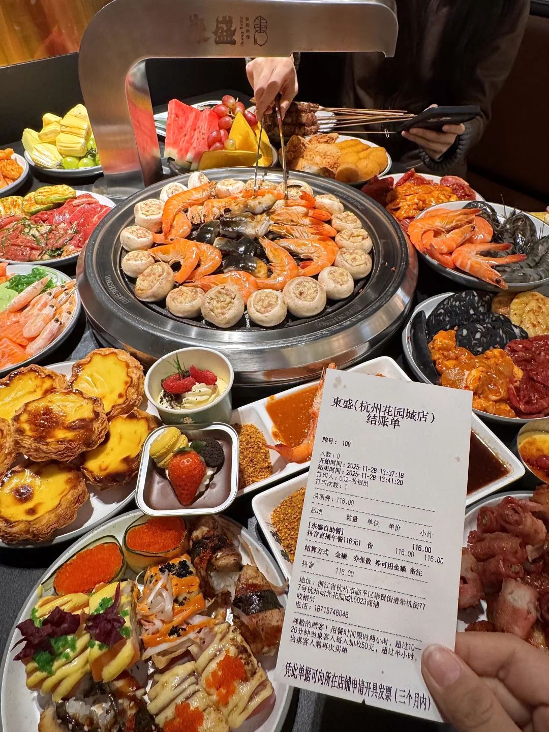 城北新开的!!速吃!杭州的自助餐请都按这个标准卷起来! 人均100出头菜品200多种!所有烤肉海鲜主食小吃水果甜品随便拿,三文鱼、黑虎虾、烤鳗鱼、鲜切牛羊肉……炭火烤得汁水丰盈,不管是蘸料还是空口吃都很妙! 真的随随便便吃回本!!!叫:东盛)