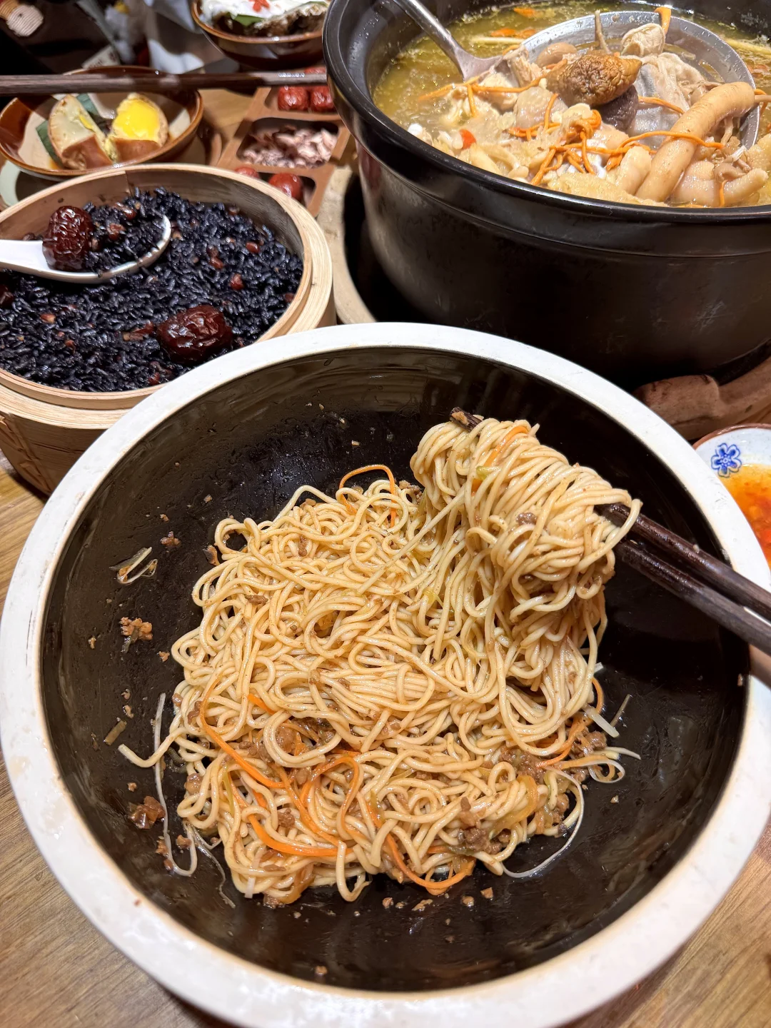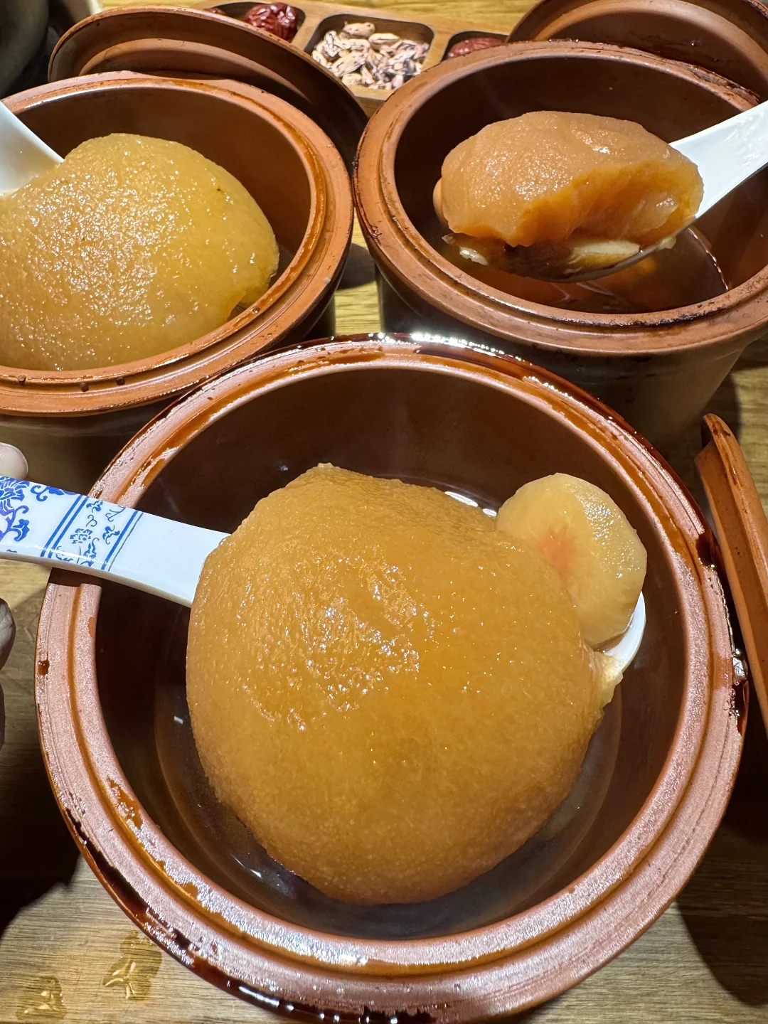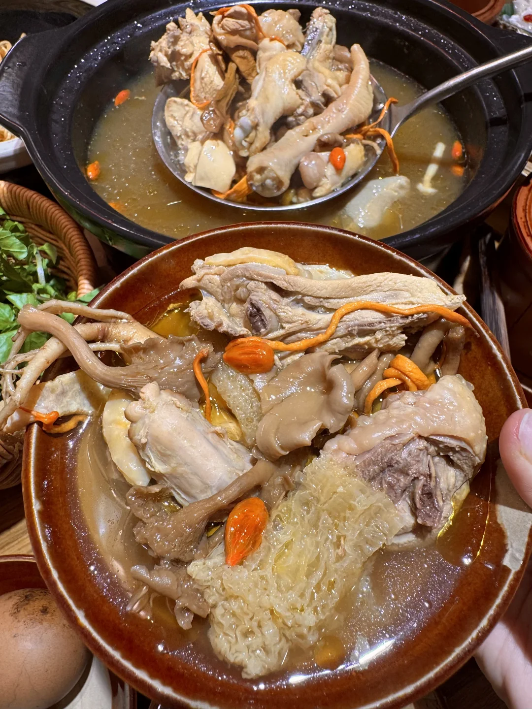 现煨的瓦罐汤!!谁懂这一口的含金量!热乎乎的很鲜甜,整颗大梨+甘蔗+马蹄……一盅下去整个人都暖和了~坐穿地铁2号线也要去吃的!! 鸡煲更是名不虚传!带有一点药膳的香气~鸡肉简单蘸点蘸料就很绝!我们还加了牛鞭、石斛苗、吊龙…真的嘎嘎好吃!宝藏店!叫:葉老头)