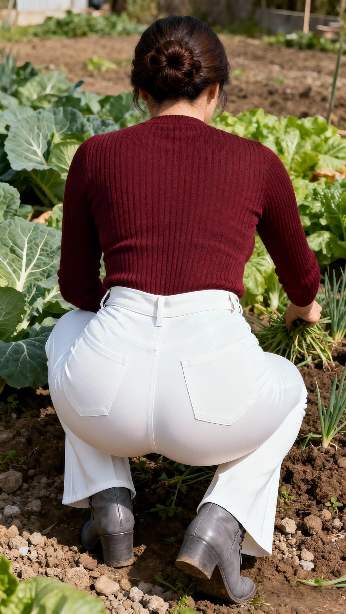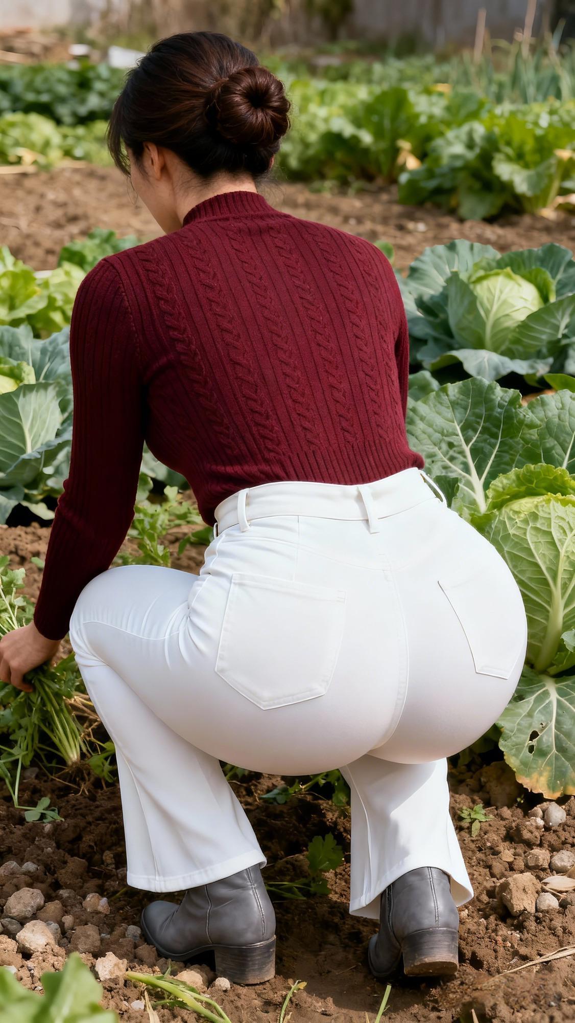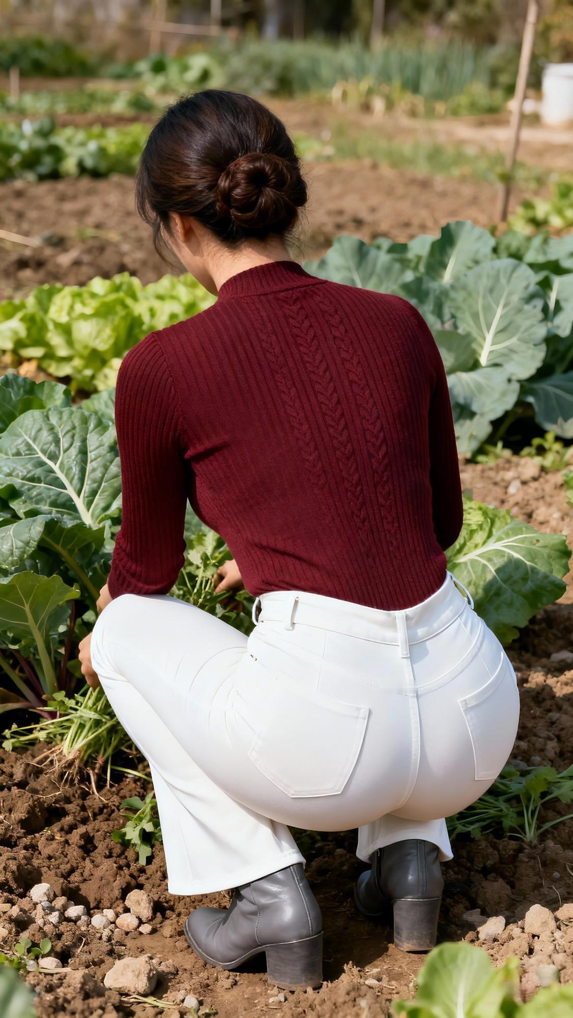 泥土的气息裹着晨露漫开,深褐的土地上,菜叶舒展着青绿的脉络。暗红针织衫的纹路与泥土的肌理相融,白色裤装轻贴着大地的弧度,在田垄间低俯的身影,指尖轻触菜畦里的葱茏。风掠过菜叶的簌簌声里,是与自然的温柔相拥,每一次俯身,都是对土地的轻语,在乡野的晨光里,把琐碎的日常揉进泥土,让日子在一蔬一菜的生长里,生出柔软的诗意。农村