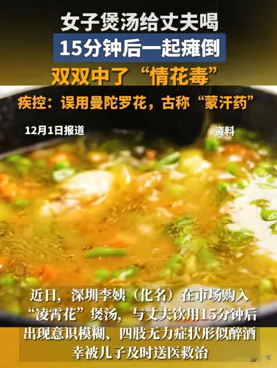 错买曼陀罗冒充的凌霄花炖汤,深圳夫妻喝汤瘫倒!这“养生花”是毒疙瘩,千万别吃! 家人们赶紧避雷!深圳一对夫妻买“凌霄花”煲汤,喝了15分钟就双双瘫倒,差点出大事! 哪是啥养生花啊,根本是掺了曼陀罗的毒花!这玩意儿就是古代“蒙汗药”,全株带毒,喝一口就头晕腿软,严重能要命! 更吓人的是,涉事市场里32%的“凌霄花”都是曼陀罗伪装的!俩花干品长得一模一样,咱普通人根本分不清,黑心商家就钻这空子坑人! 听我一句劝:不管是啥“养生花”“安神花”,不认识的别买,散装的别碰,更别往锅里放!尤其是给爸妈买药材,一定要去正规药店,别贪便宜买路边摊的散装货! 要是喝了汤觉得口干、心慌、看东西模糊,赶紧停嘴,带着剩汤去医院,别耽误!养生是为了保命,可别让黑心商家把“养生汤”变成“夺命汤”! 赶紧转发给身边爱煲汤、信偏方的朋友,让更多人知道这坑! 冬日生活打卡季曼陀罗 凌霄花