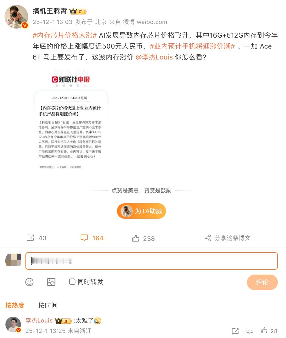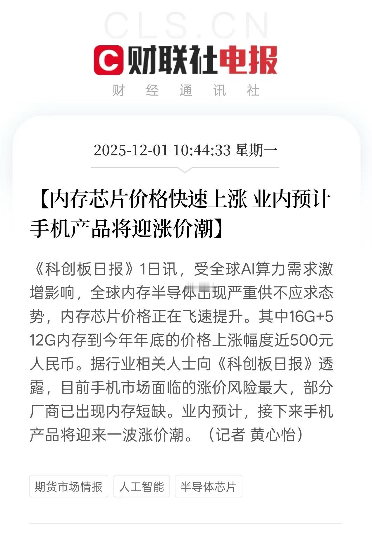 内存芯片价格大涨这段时间内存涨价的新闻层出不穷,今天更是有媒体曝出16G+512G内存单块成本涨500。看来不止已发布的机器不会降价,接下来的新机价格也都不会便宜。这个月最先要发的就是一加,李杰也表示现在厂商都很难,看来这次的一加 Ace 6T起售价比去年的Pro也只高不低。业内预计手机将迎涨价潮