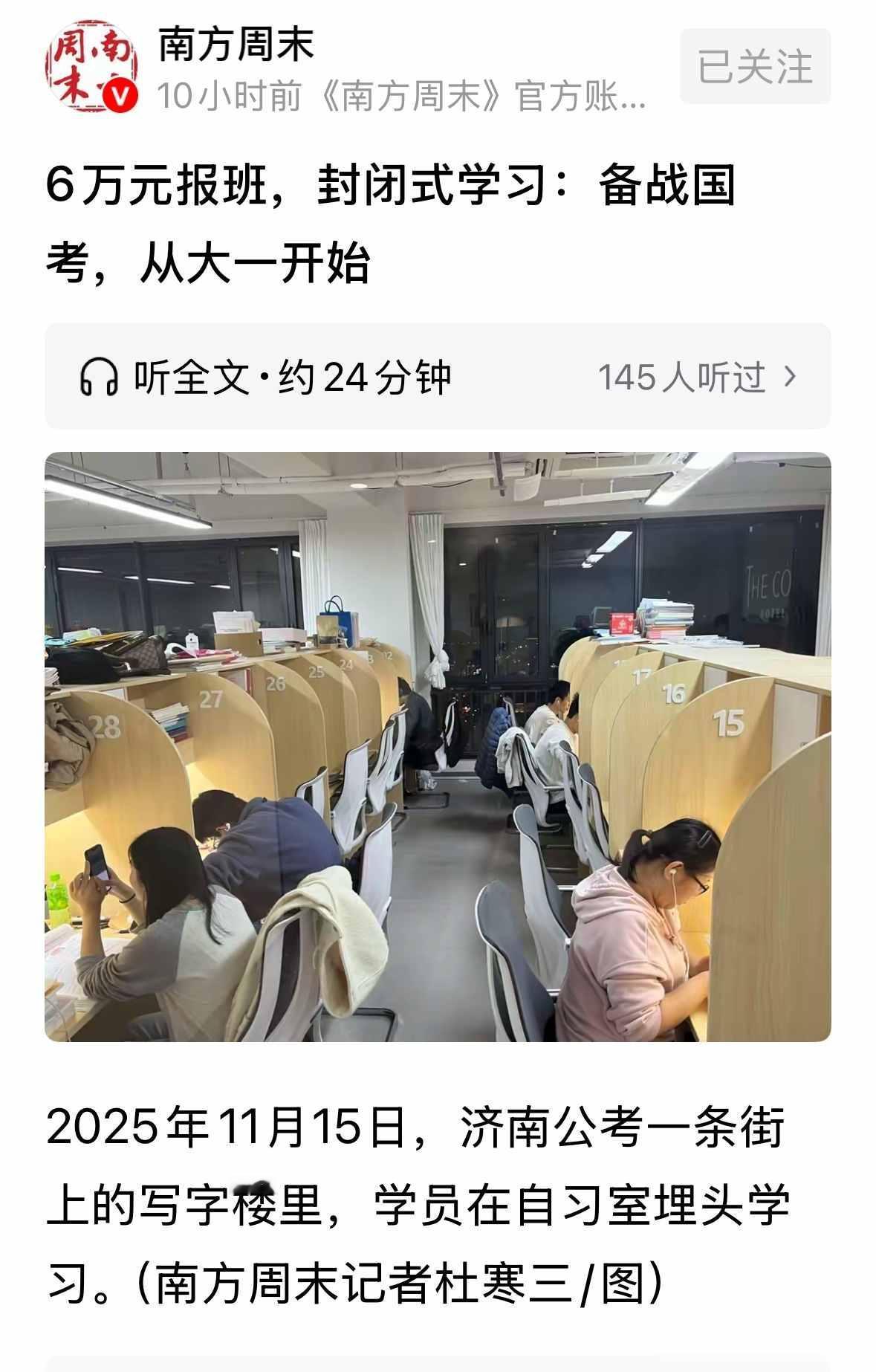 公务员国考成为当下最激烈的“高考”。 我常在晚上十点的食堂看见他们,保温杯里泡着枸杞,笔记本上抄着申论范文,手机屏幕亮着“2026国考倒计时310天”的红字,他们吃着泡面,用泡面桶装笔,在油腻的餐桌上一笔一画地画着将来。 十年前表哥考公务员,全村凑钱摆了桌酒,那时国考三十个人抢一个名额,现在表弟大二就催我帮他找复习资料,他说晚一年就晚十年,县城高中的班主任总说考上大学就上岸,可我们这一届三千人,两千人读过本科,毕业那天飘的不是学位帽,是写满进面的纸条。 有人把考研宿舍叫成国考孵化站,凌晨四点路灯下总有人捧着历年真题背法律条文,外卖小哥王叔说现在送餐最火的不是宿舍楼,是培训中心的自习室,有人连着三个月每天买两个饭团当午饭,去年冬天我路过考场,听见监考老师叹气,这考场比高考还挤,走廊都坐满了陪考的家属。 表姐去年考了三次都没上岸,现在便利店值夜班时还拿着手机刷题,她总说我们这代人像被风吹散的蒲公英,可每次发工资那天,她朋友圈准转新招考公告,妈在电话里说考不上就回老家吧,可老家乡镇银行去年招三个人,简历堆了三个纸箱。 国考报名系统关掉那天,隔壁宿舍有人摔了门,可第二天早上六点,那小子又抱着《行测速算手册》冲进食堂,那儿的灯,总亮着下一届考生的影子。