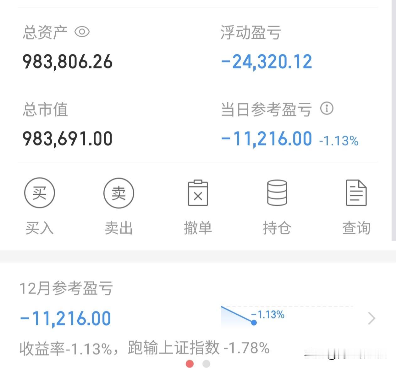 12月第一天,开门黑。百万实盘炒股日记,第六天,下午收盘 亏损比中午进一步扩大11216,并且是在指数最高点(3914)收盘的情况下。今天结束,我期待明天帮助加倍涨回来即可。 炒股嘛,亏亏赚赚的很正常,我不相信,他能把我的票子给亏完。12月还剩下最后22个交易日,机会并没有多少,除非运气开始偏爱我,就有机会随时变盘向上。 我的资自选里面50来只票,有90%今天都是红盘,这是招谁惹谁了。这么埋汰 持仓的软件下午继续砸,证券继续创新低。这是被主力盯上了吗? 板块方面,Ai手机、金属、果指数华为手机等涨幅居前 跌幅居前的有,互联网电商、保险、数字水印、电子身份证、海南自贸区等。 两市今天放量近3000亿,说明有机构在扫货,而散户在卖出。