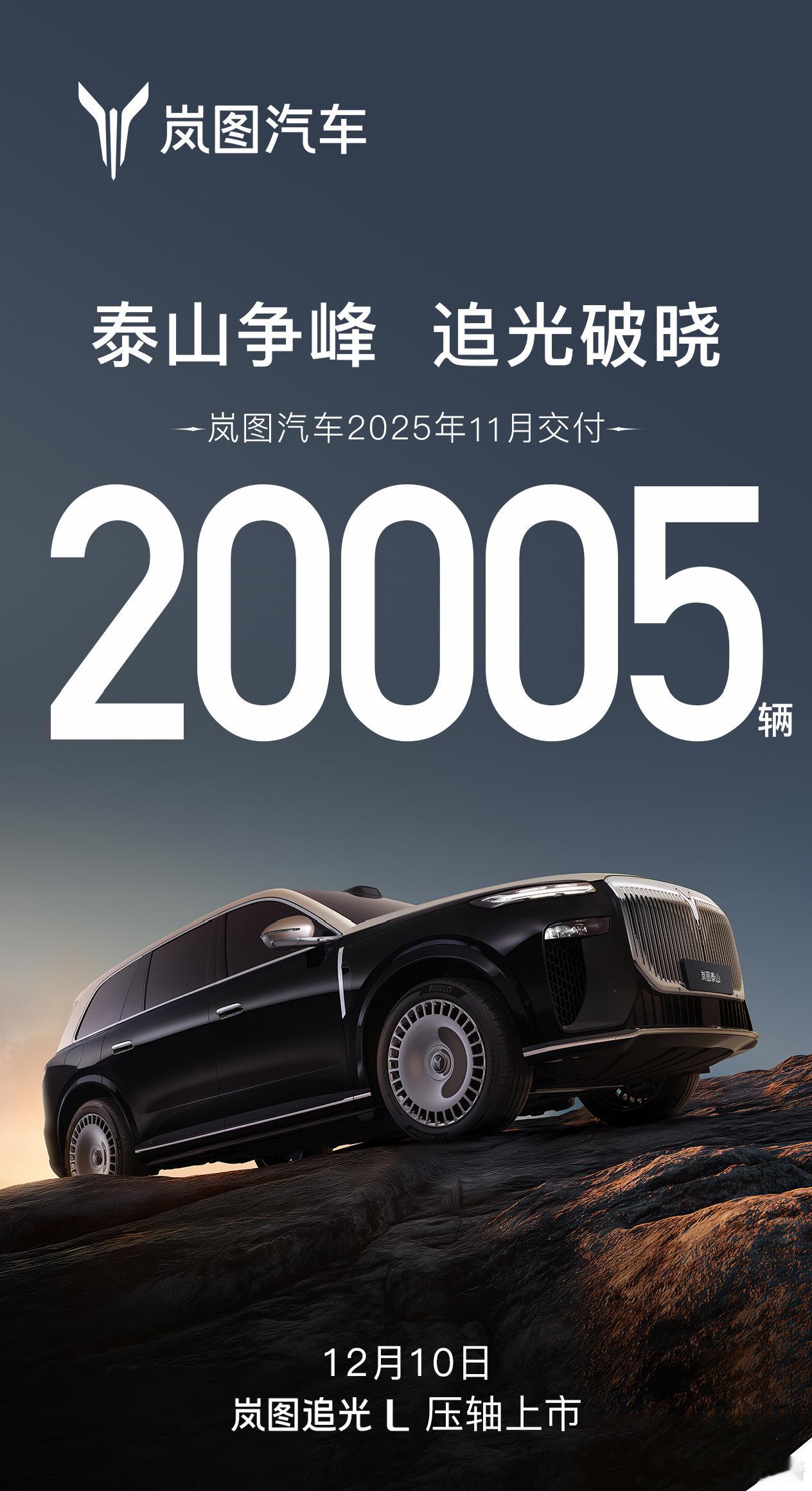 岚图汽车 11 月交付 20005 辆,创下了新纪录12 月 10 日还有岚图追光 L 的上市岚图汽车新能源汽车