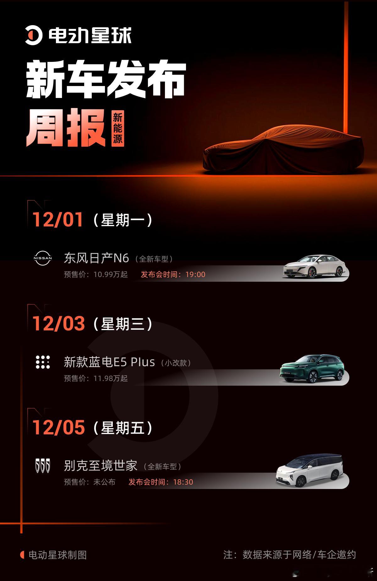 新车发布周报来了(12.1-12.7)今晚的 N6 发布会宣称是「史上最舒适的发布会」,现场座位都是日产沙发!刚好有同事去参加,让他去感受一下。新能源汽车东风日产N6别克至境世家