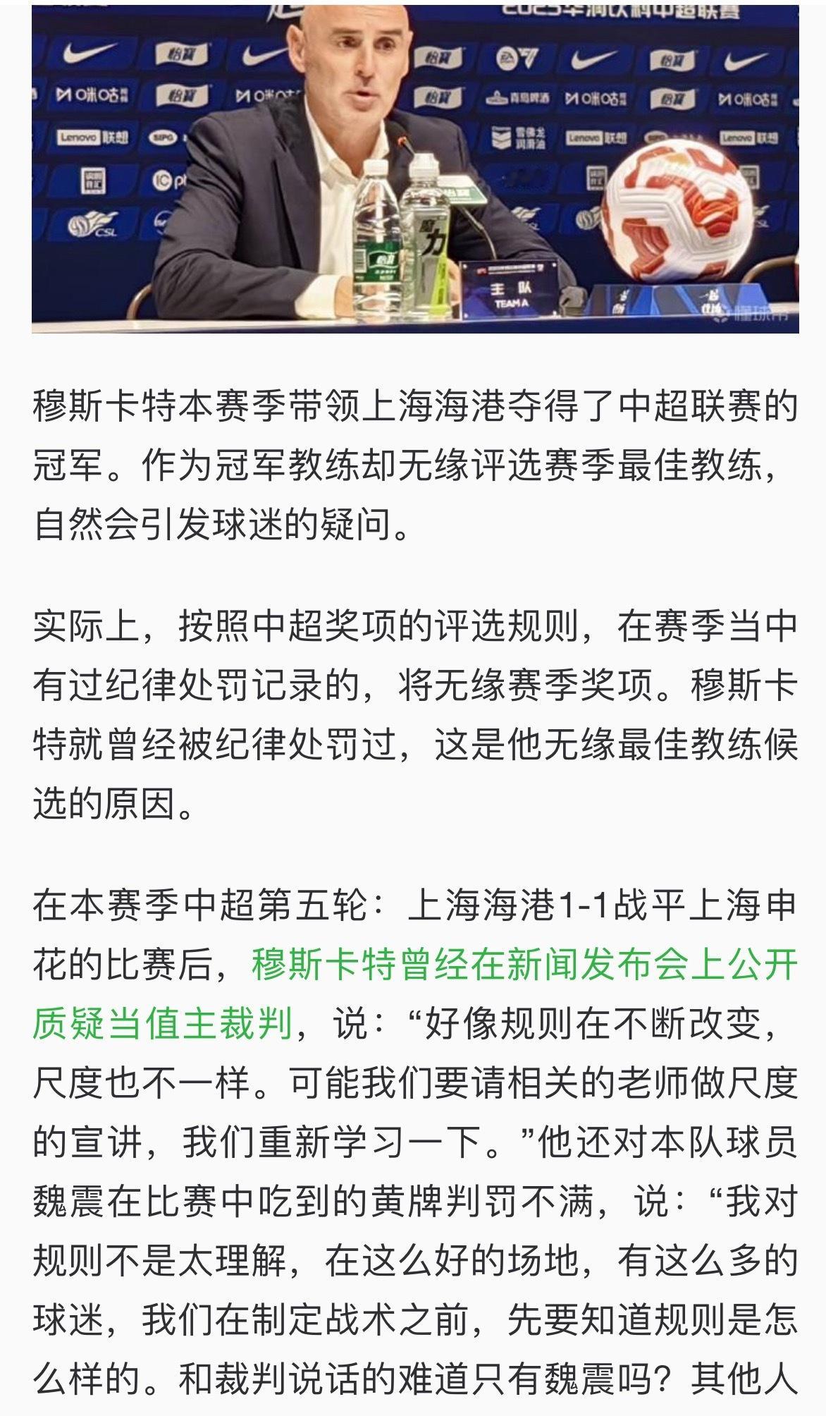 中超各项最佳评选中,穆斯卡特因在4月德比赛后吃到过纪律处罚罚单而无缘当时,光头提到了“学习规则”一说当然,若从带队卫冕、尤其是在球队经历如此多变动情况下依旧夺冠的角度来说,穆斯卡特其实已经是许多人心目中的最佳。忽然想到,除穆斯卡特外,前两位带队夺冠的教练、都曾因为相同的原因无缘赛季最佳评选。此外让人高兴的是,在最佳新秀评选中,海港有三人入选:蒯纪闻、李新翔、吾米提江上海海港