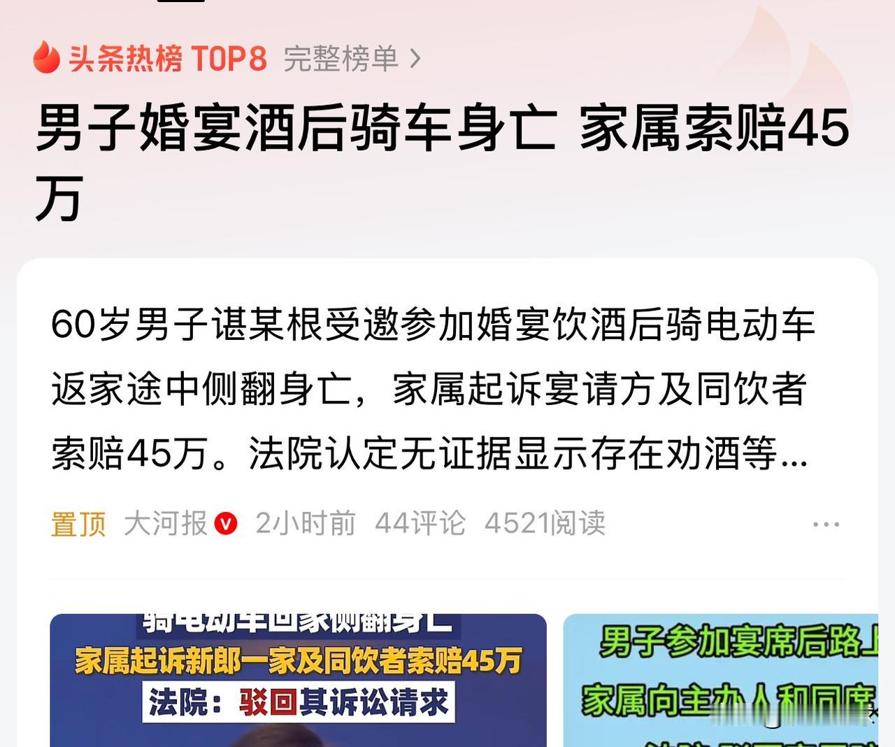 男子喝酒回家路上身亡:家属索赔! 看完久久不能平静,这是道德“后退”,这属于“讹诈”吧? 男子时成成年人,喝酒不喝酒自己完全有能力判断,危险不危险自己能把握。 这个法官公正,坚持了公正判决,没有开“不好”先例,为这个法官点赞👍 希望这种例子越少越好🙏 男子婚宴酒后骑车身亡 家属索赔45万
