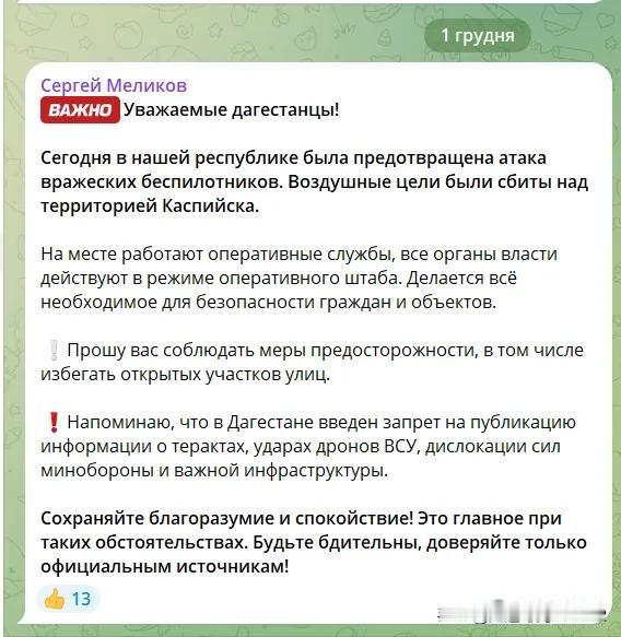 今晨,俄罗斯卡斯皮斯克遭到袭击,目标海军基地 12月1日凌晨,乌克兰无人机再次攻击俄罗斯,达吉斯坦的卡斯皮斯克市传来爆炸声,攻击目标,俄罗斯里海舰队。 报告称,今晨,达吉斯坦,卡斯皮斯克遭到袭击,目标很可能是卡斯皮斯克海军基地,具体细节正在澄清中。 达吉斯坦领导人梅利科夫证实这次袭击的事实。 他呼吁市民,禁止“发布有关恐怖袭击、乌克兰武装部队无人机袭击、武装部队部署及重要基础设施的信息。 卡斯皮斯克位于里海海岸,是达吉斯坦首都马哈奇卡拉的卫星城。 俄罗斯里海舰队的海军基地就设在这座城市。 该基地驻扎着以下部队: 第414独立海军陆战队近卫营; 第46独立海军陆战队岸基导弹营。 据悉,该导弹营编有两支“巴尔”岸基导弹系统的导弹连,总计配备4套发射装置,一次齐射,可发射32枚反舰导弹。