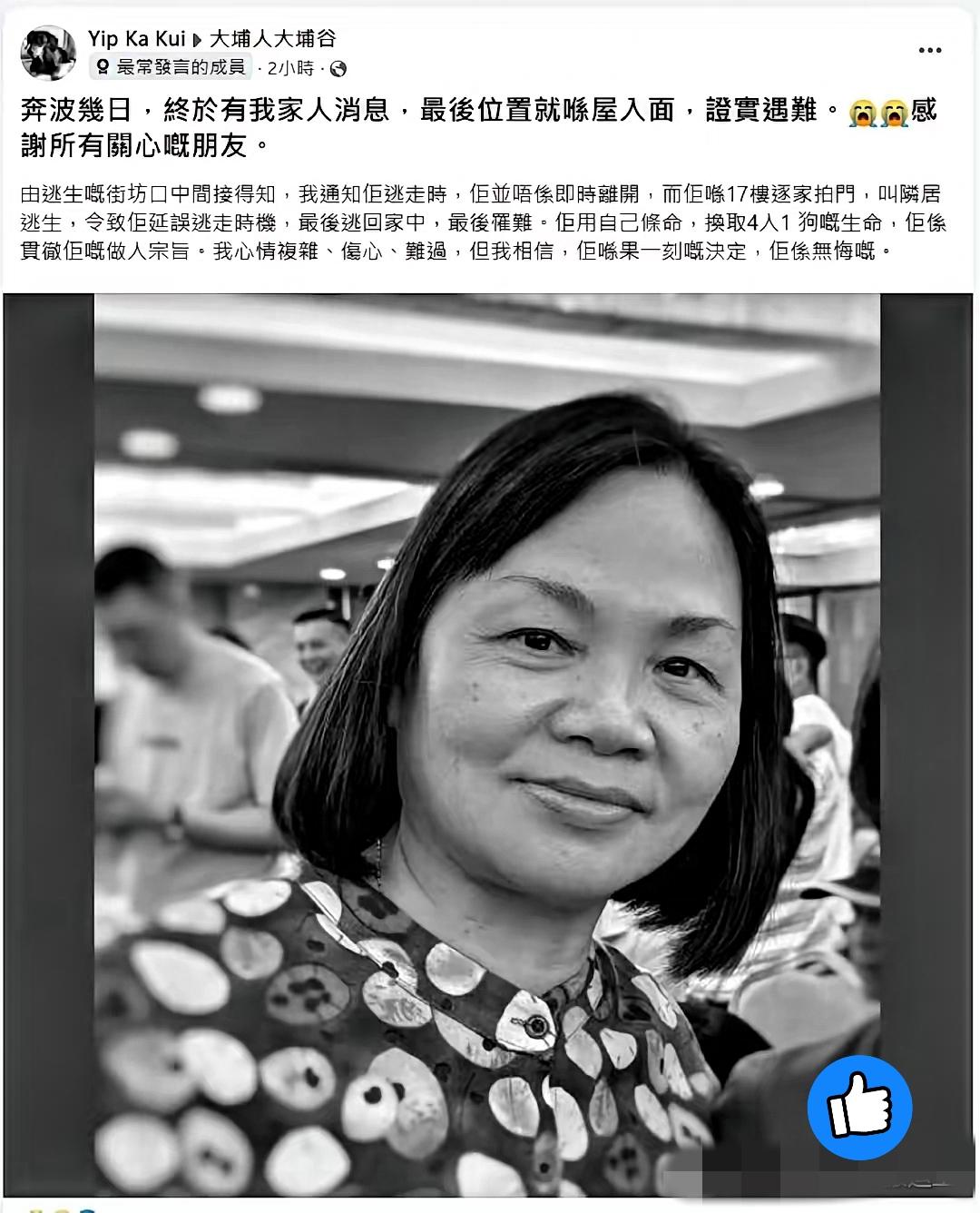 香港17楼那位女士,用自己的命换了4人1狗的生机,看完真的破防又敬佩! 火灾里她本有逃生机会,却转身逐家逐户拍门提醒邻居,把生的希望让给别人,自己却错失最佳时机不幸罹难。 这不是简单的善良,是生死关头刻在骨子里的大义,是明知危险仍选择挺身而出的勇气。 在人人慌着自保的时刻,她的选择照亮了黑暗。 这个世界从不缺冷漠,缺的是这种愿意为陌生人赌上性命的温暖。 她的离去让人痛心,但这份善意会永远留在邻里心里,成为最珍贵的念想。 如果换作是你,火灾中会选择先自保还是提醒他人? 来评论区说说你的心里话~