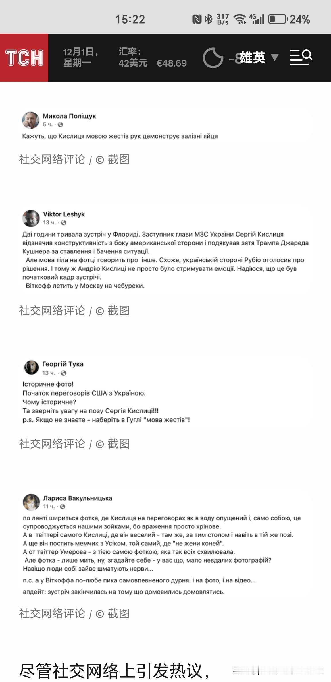 谈判图片中沮丧的表情,引发社交网络恐慌:基斯利察被迫安抚乌克兰人 乌克兰与美国代表团在佛罗里达州迈阿密就和平解决(问题)举行的谈判,因乌克兰政客的表情,而引发社交网络上的热烈讨论。许多用户对乌克兰外交部副部长基斯利察,在某一画面中“沮丧”的神情表示担忧。 基斯利察本人对这一情况发表了评论,呼吁乌克兰人不要恐慌: “既然很多人对我们的表情,怀有如此浓厚的兴趣和担忧,但请别担心!保持冷静,保持乌克兰人身份,像我和斯捷潘尼申娜一样,”基斯利察在回应讨论时这样写道。 此前,网络上流传的照片,引发了这场讨论,评论者认为,照片中的基斯利察“神情落寞”。这引发了传言,称美方可能已向乌方宣布了某项令人不快的决定。 尽管社交网络上引发热议,乌克兰方面对谈判的官方评价是积极的。