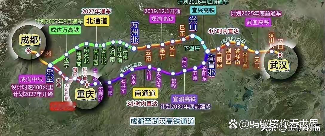 成都到武汉高铁大通道何时建成? 南通道和北通道有什么不同?分别经过哪些地方? 沿线的朋友期待吗? 成都是西南地区的经济中心,武汉是华中地区的经济中心,成都到武汉的高铁大通道非常重要。借助武汉,不仅可以快速到达华中地区,还可以到达经济发达的华东地区。 蓉汉高铁大通道是沪汉蓉沿江高铁的重要组成部分,连接了中国经济最发达的长江经济带,串联起长三角城市群、长江中游城市群、成渝城市群。 蓉汉高铁大通道分为北通道和南通道,北通道由成达万高铁到万州,再由郑万高铁到兴山,再由宜兴高铁到宜昌;南通道由成渝中线高铁到重庆,再由渝宜高铁到宜昌。目前除渝宜高铁段外,其他各段均已通车或在建。 那么,关于成都到武汉的高铁大通道,您最期待的是什么呢?