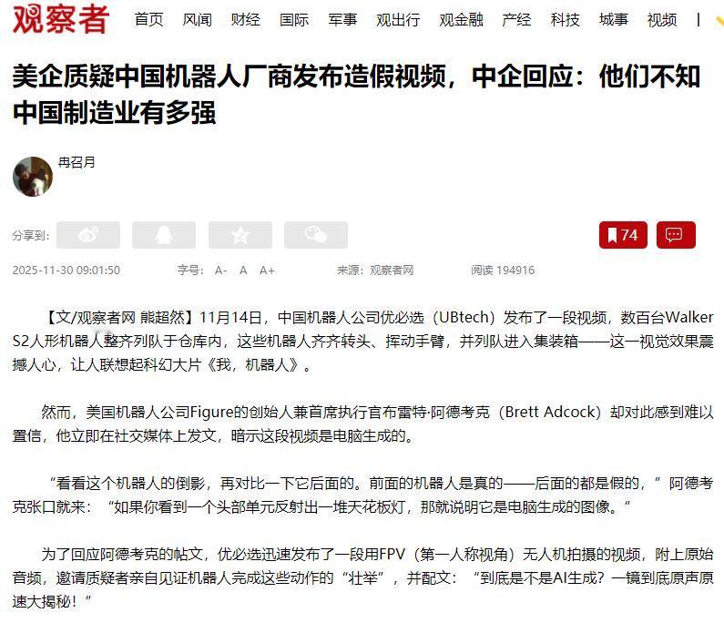 中国机器人厂商发布了“造假”视频! 11月14日,优必选数百台人形机器人同步列队、挥臂入箱的视频震撼全网,却被美国Figure公司CEO阿德考克当场“打假”,直言“倒影不对,视频是电脑合成”。说实话,他们不相信很正常,因为他们达不到这个水平,自己不行就质疑别人也不行,这是西方国家的一贯作风。 中国机器人产业的硬实力,早就不是靠一段演示视频就能说清的了,核心是有国家层面的规划和实实在在的行业数据撑着。 比如工信部的《“十四五”机器人产业发展规划》里,就把机器人产业列为重点发展方向,国家还专门搞了“智能机器人”重点专项,砸了超3亿元资金支持技术创新。 更能说明问题的是国际机器人联合会(IFR)的最新数据:2023年中国制造业里,每万名员工就能分到470台机器人,全球排第三。 而2018年咱们还只排第20位,短短几年就翻了倍。这种跨越式发展,背后是国家把机器人产业当成培育新质生产力的关键抓手,从顶层设计到资金支持的一整套推动,可不是简单一句“产业链协同”就能概括的。 要说一个产业成不成熟,看标准建得怎么样就知道了。今年咱们国家首批人形机器人技术国标已经获批立项,像环境感知、运动控制这些关键领域的标准都覆盖到了,填补了不少国内空白。 有意思的是,优必选还是这个国标的共同发起者,还牵头制定了机器人作业操作的技术要求——这就意味着,中国企业已经开始参与制定全球机器人行业的规则了。 全国机器人标准化技术委员会的专家也说,有了国标,企业研发、生产、应用就能有章可循,为大规模量产打牢基础。 从只会造产品,到能牵头定标准,这就是中国制造业实力升级的最好证明,哪是海外同行靠“看倒影”就能随便否定的? 更关键的是,咱们的机器人早就不是实验室里的样品了,而是真真切切走进工厂,当起了“新工匠”。 中国工业互联网研究院就有现成案例:在汽车制造车间里,人形机器人能一边拧发动机螺丝、一边做焊接,干活效率接近人工。 而且今年9月,国内已经出现了亿元级的人形机器人单笔订单,物流运输、物料分拣这些领域的试点也在全面推进。 这些实打实的应用数据都说明,机器人组队协同、精准操作的能力早就过了工业场景的检验,优必选视频里那些阵列动作,不过是咱们产业真实实力的一个小缩影而已。 可就算这些实打实的实力摆在眼前,还是有海外同行不相信。前段时间优必选发了机器人组队的视频,美国有家机器人公司的老板直接跳出来说视频是电脑做的,理由居然是“机器人倒影不对”。 这种质疑其实挺常见的,之前福建舰曝光电磁弹射系统的时候,也有美国专家出来质疑。 说到底,就是他们还抱着老眼光看中国制造业,压根没跟上咱们产业升级的节奏,对咱们的实力一无所知。 面对这种质疑,优必选也没废话,直接放出了无人机一镜到底的原声视频,还邀请质疑者来中国实地考察。 这份底气,说白了就来自咱们的标准建设和工业应用实绩。就像工信部官员说的,中国机器人产业发展靠的是自主创新,目的是推进新型工业化,走的是实打实的路子,根本没“造假”的空间。 那些海外质疑者,既没看到这些官方认可的行业进展,也不了解背后的标准体系和应用案例,就凭着光影倒影下结论,本质上是没搞懂中国产业的发展逻辑。 其实这些质疑,反而成了咱们机器人产业发展的“试金石”。从国家层面的战略布局,到行业标准的搭建;从工厂里的实际应用,到亿元级订单的认可,中国机器人产业的每一步都走得很扎实。 这背后反映的,是中国制造业从“拼规模”到“拼质量”的深刻转变,也是培育新质生产力的生动实践。 未来随着“十五五”规划的推进,中国机器人产业还会在创新中突破瓶颈。那些戴着有色眼镜的质疑,最后都会被产业发展的实绩打破。 毕竟,中国制造业的硬实力,从来都不是靠嘴说的,而是靠事实证明的。