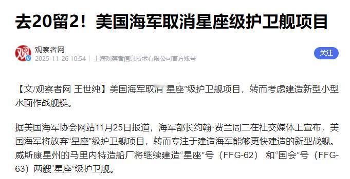 “美国海军天塌了!”当地时间2025年11月25日,美国海军部长约翰·费兰一条社交媒体消息,备受期待的星座级护卫舰,原计划造70艘撑起美国海军的“门面”,结果现在直接砍到只剩2艘——已经开工的“星座号”和“国会号”,其余订单全被一刀两断。 这仅存的两艘护卫舰,离谱程度能把人看笑。首舰“星座号”2022年8月就敲了开工锣,到2025年11月都三年多了,完工率刚到12%,连个完整的舰体轮廓都看不真切。 当初拍着胸脯说2026年就能交付,现在直接把日期改到了2029年,一下拖出去三年。 钱更是像流水一样花出去,原本计划单艘10亿美元顶天,现在最新估算飙到14亿,超支近一半。 算上研发和已投入的建造费,差不多20亿美金砸进去,就换来两个泡在船坞里的“半拉子工程”,美国纳税人的血汗钱就这么打了水漂。 当初美军选这个项目,本来是想走捷径——拿欧洲成熟的FREMM护卫舰设计当蓝本,按理说该稳稳妥妥。 结果硬是被自己人折腾黄了,国会山的议员为了拉选票,硬把“美国制造”比例从60%提至80%,逼着船厂换供应商。 海军更过分,今天要加电子战接口,明天又要预留高超音速导弹发射位,平均每周就提3项修改要求。到最后,星座级和原型舰的通用度只剩15%,跟重新设计没区别。 这事儿表面看是项目管理混乱,往深了挖,全是美国造船业“空心化”的老病根。 负责造舰的马里内特船厂,是美国仅存的几家能造护卫舰的船厂之一,可生产设施还是几十年前的老底子,2020年才由母公司芬坎蒂尼集团勉强做了点改进。 更头疼的是用工荒,经验丰富的老工匠陆续退休,年轻人嫌造船又苦又累不愿来,船厂只能靠涨工资抢人,成本自然水涨船高。 雪上加霜的是供应链,2023年美国钢材价格一下涨了35%,关键零部件要么断供要么延期,2023年4月船厂还遭了黑客攻击,数控机床的指令系统瘫痪,船台停摆好几天等零件是常事儿,进度能不拖吗? 美国海军现在真是进退两难:想维持全球霸权,就得有足够的军舰撑场面;可造一艘烂一艘,成本高得吓人,国会还天天卡预算。 星座级砍单后,他们嘴上说要搞“更快建造的新型战舰”,但连成熟设计都改不明白,新舰就能靠谱吗? 说白了,这根本不是技术问题,是制度问题。军工复合体垄断市场,通用电力这样的巨头承包了核航母、核潜艇建造,漫天要价都没替代品。 国会和军方互相扯皮,一个为选票提无理要求,一个为政绩瞎改方案;造船业人才流失、产能空心,这些毛病凑在一起,不翻车才怪。 70艘护卫舰计划泡汤只是冰山一角,背后是整个海军装备体系的崩塌,是美国制造业衰落的缩影。 以前靠航母舰队耀武扬威,现在连艘靠谱的护卫舰都造不利索,未来十年舰队规模减半都是大概率的事。 这“天”,不是塌在一艘船的烂尾上,是塌在日积月累的浮躁和短视里,想扶都扶不起来了。