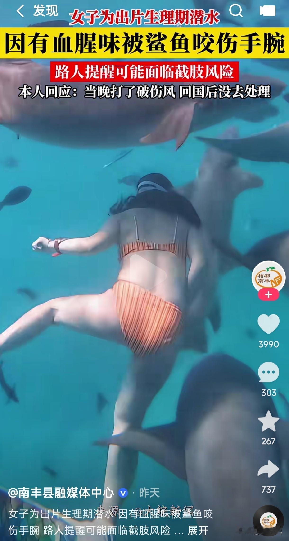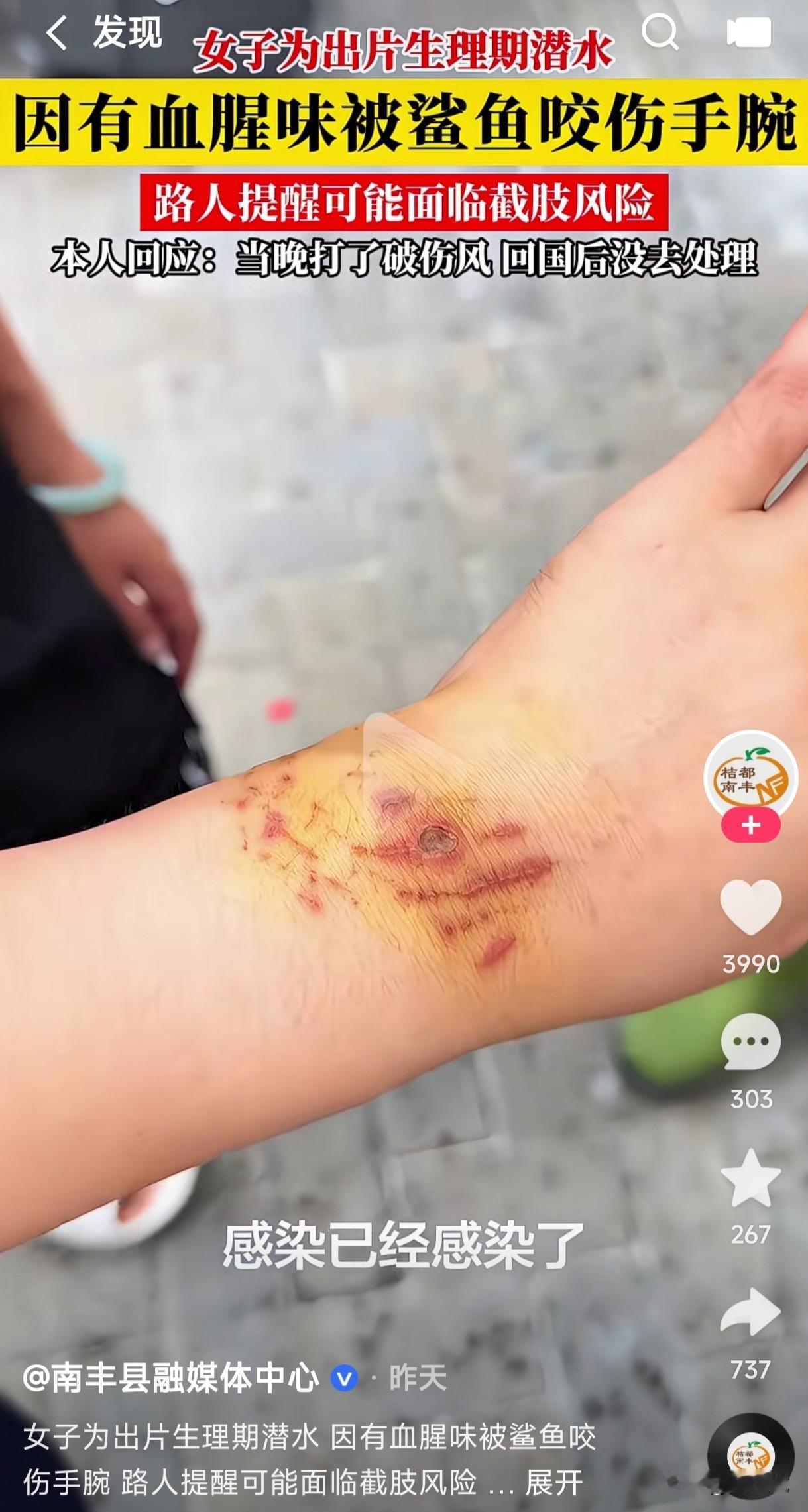 女子为了出片居然生理期潜水,因为有血腥味被鲨鱼咬伤手腕已经导致感染,被路人提醒可