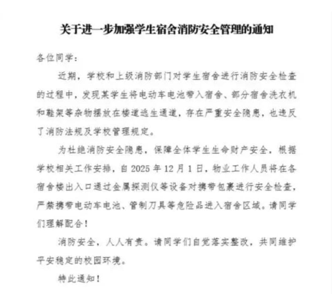 学生回宿舍必须要接受安检,这到底是为了学生好?还是说在侵犯学生隐私? 最近暨南大学公布的一项管理规定,可是在网上引发了轩然大波。就是从12月1日开始,将会有人在宿舍门口,拿着金属探测仪进行安全检查,严禁学生携带电动车电池,以及管制刀具进入宿舍。此消息一出立马引发了学生的反对,不少学生认为这样做,就是在侵犯他们的隐私,所以他们相当的不满。而随后学校这边表示,之所以这样做是为学生安全考虑,怕有人带电车电池进宿舍,而一个宿舍有几名学生就有几个家庭,就是担心引发火灾,所以会长期坚持下去。 不可否认的是,学校这个做法,的确可能让人不舒服,在某种程度上,也是会对隐私进行侵犯,可我觉得这样做没任何问题,而学校的担心也不无道理。现在一些大学生为了上课方便,普遍会购置电动车来代步。而学校一般也会有充电的区域,可由于距离太远,又或者是充电相对较贵,所以就有学生拆掉电池,带回宿舍来充。其实这是有很大的安全隐患的。 之前就有武汉一名大三学生,他在校外租房做兼职时,室友不听劝阻带电池电池到屋里充电,结果最后引发了火灾,他全身90%的面积被烧伤,不仅是帅气的样貌被毁了,美好人生也是彻底被毁了。可纵使这样的教训足够深刻,可仍旧有人抱有侥幸心理,继续是我行我素。不发生火灾还好,一旦发生火灾,毁掉的不仅仅是几个大学生,而是几个家庭。所以暨南大学此举,看似是在为难学生,其实不过就是对他们的另类保护而已。 咱们国家的地铁为何如此安全?就是因为有强大的安检系统。谁会觉得安检系统没必要?谁又会反对安检呢?除非是那些别有用心之人。所以有些规矩看似是约束,其实就是一种保护而已。一些学生之所以不支持,无非是因为关上了他们的方便之门而已。而对于这项管理规定,我相信但凡明智之人,都没有理由会反对!