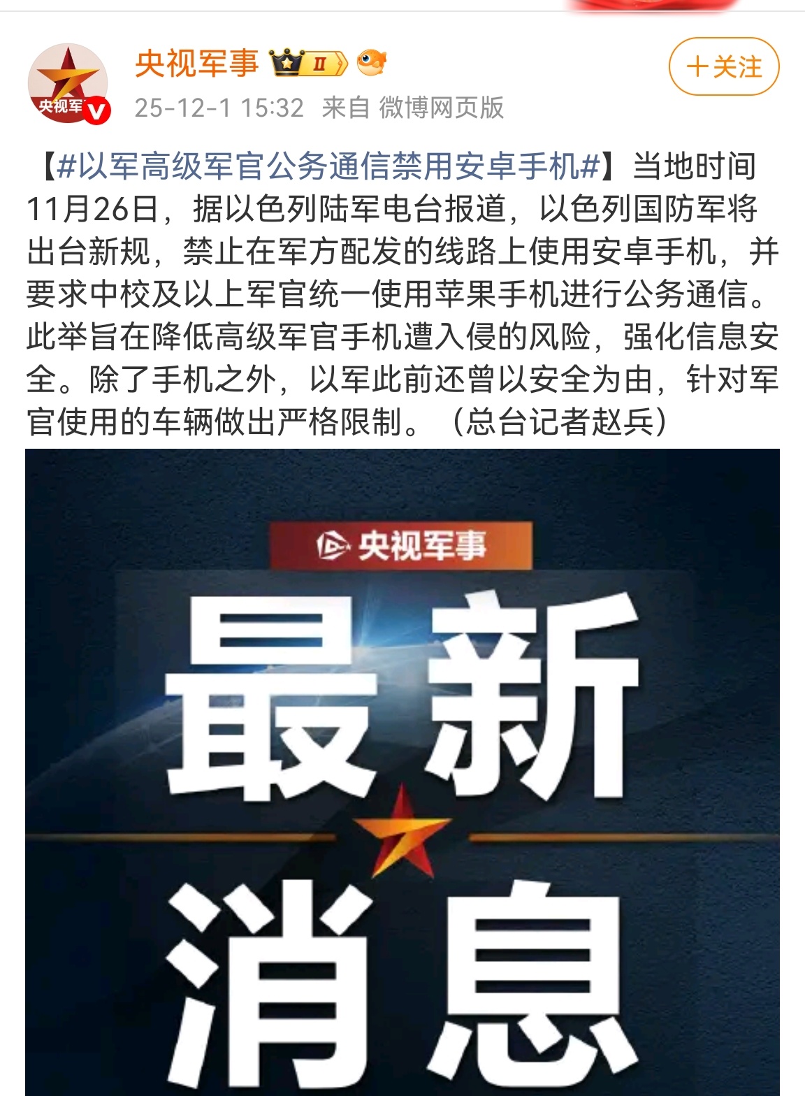 🔻以色列军队禁止使用安卓手机,必须使用苹果手机。🔻以色列在怕啥呢,该不会是怕手机里面有炸弹吧?