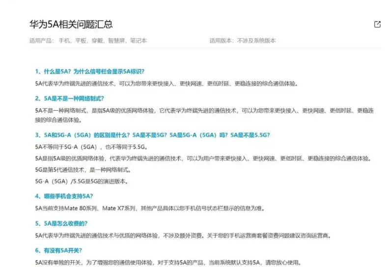 关于“5A”华为官方给出了回应了… 据华为官方最新消息称,“5A”不等同于5G或者5GA,“5A”是指5A级的优质网络体验,代表华为终端先进的通信技术,可以为用户带来更快接入、更快网速、更低时延、更稳连接。 “5A 级通信的体验”,背后就是基带和算法,还有就是最重要射频技术的全自主闭环。 目前支持“5A”的终端设备有mate80系列,和mateX7系列,后续会有更多机型加入的。