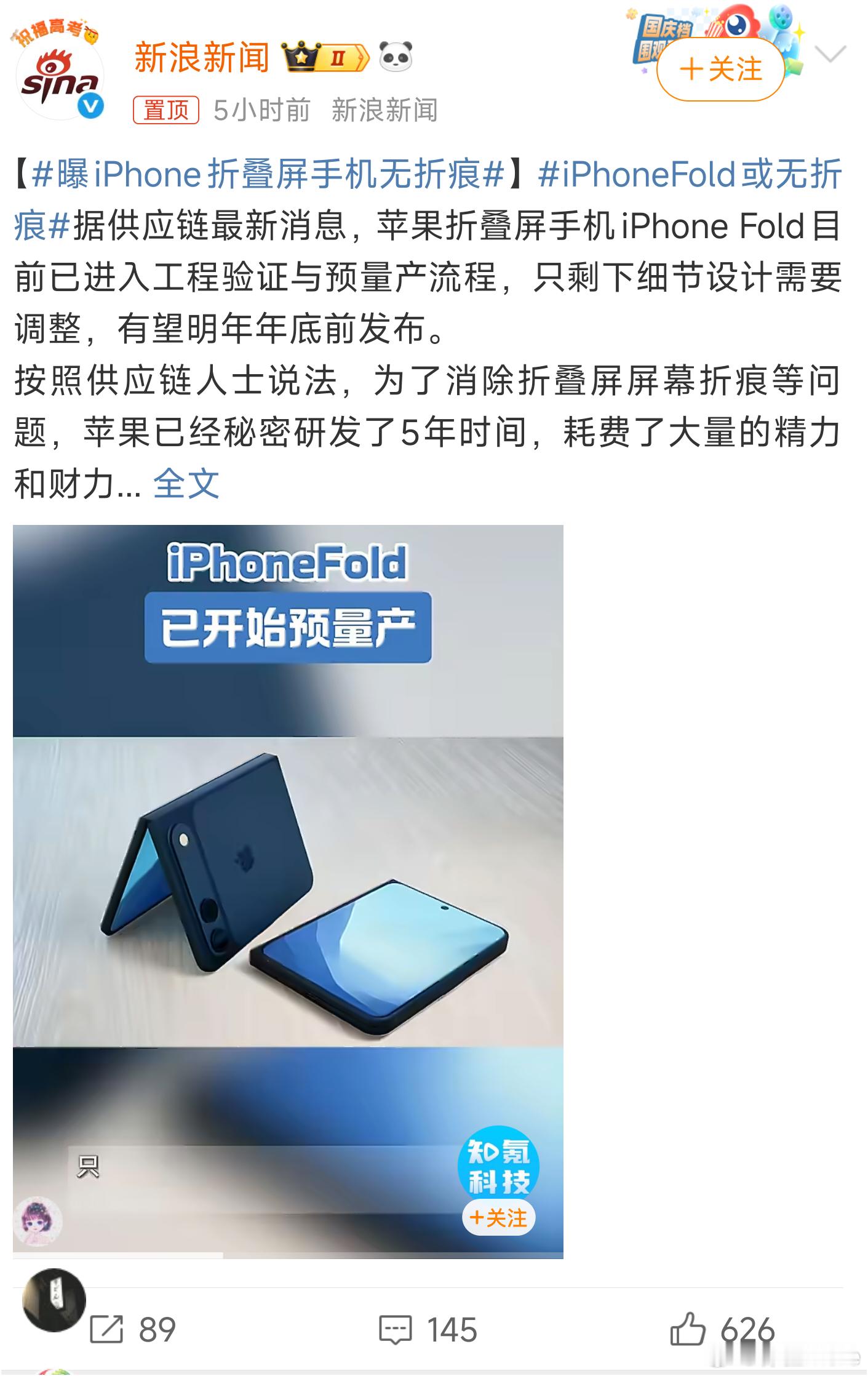 折叠手机哪家折痕控制得最好OPPO吧,上代折叠屏里,OPPO Find N5的折痕最浅。反正现在大折叠的折痕已经不影响正面观感了,我更看重续航和轻薄。今天“曝iPhone折叠屏手机无折痕”上了热搜,屏幕由三星显示供应,面板结构和材料处理是由苹果自己来搞,行业内没人怀疑苹果的研发能力,希望折痕能进步很大吧。