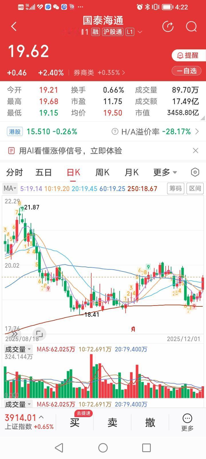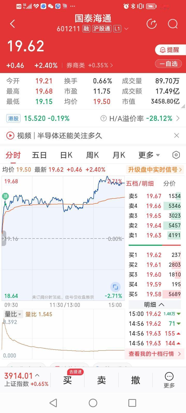 国泰海通,救驾成功!国泰海通无惧周末东财减持和天风立案两大利空打压,股价高开高走,逐波攀升,引领券商股全线反弹,并助力上证指数成功重返60日均线上方。 国泰海通今天开盘价19.21元,高开0.26%,收盘大涨2.40%,收盘价19.62元。居头部券商股涨幅排行榜第一名。 国泰海通虽然两度回踩年线,走势不算太强,但能顽强守住年线,不破年线,比中信证券和东方财富强多了。