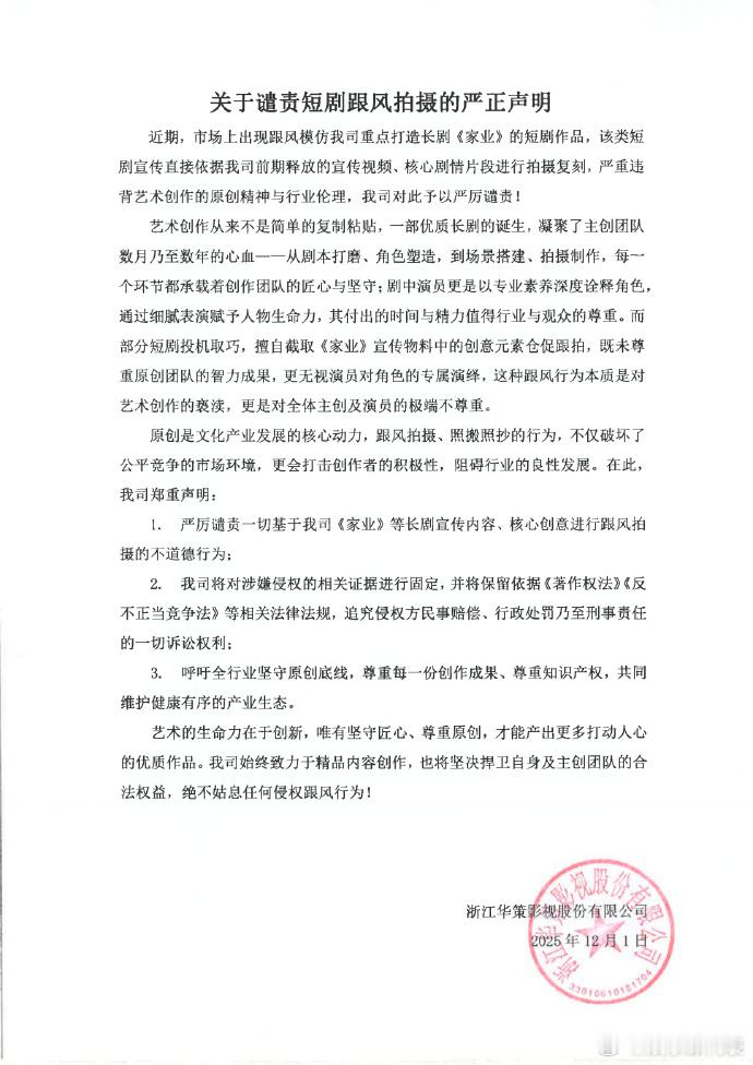 华策谴责短剧跟风拍摄长剧家业 华策影视今日发布严正声明,直指部分短剧制作方恶意抄袭其未播长剧《家业》的核心创意与宣传素材,引发行业对原创保护的激烈讨论。