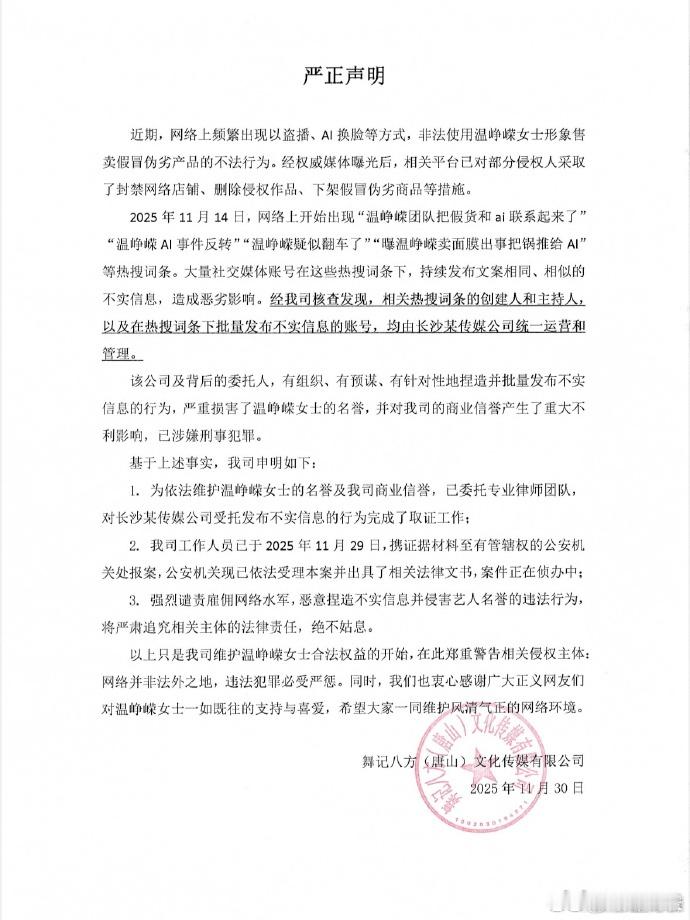 温峥嵘已报案温峥嵘发声明 近日,网传温峥嵘用AI卖假货、卖面膜出事把锅推给AI等引热议。12月1日,发文称已报警立案,并晒出受案回执。↓