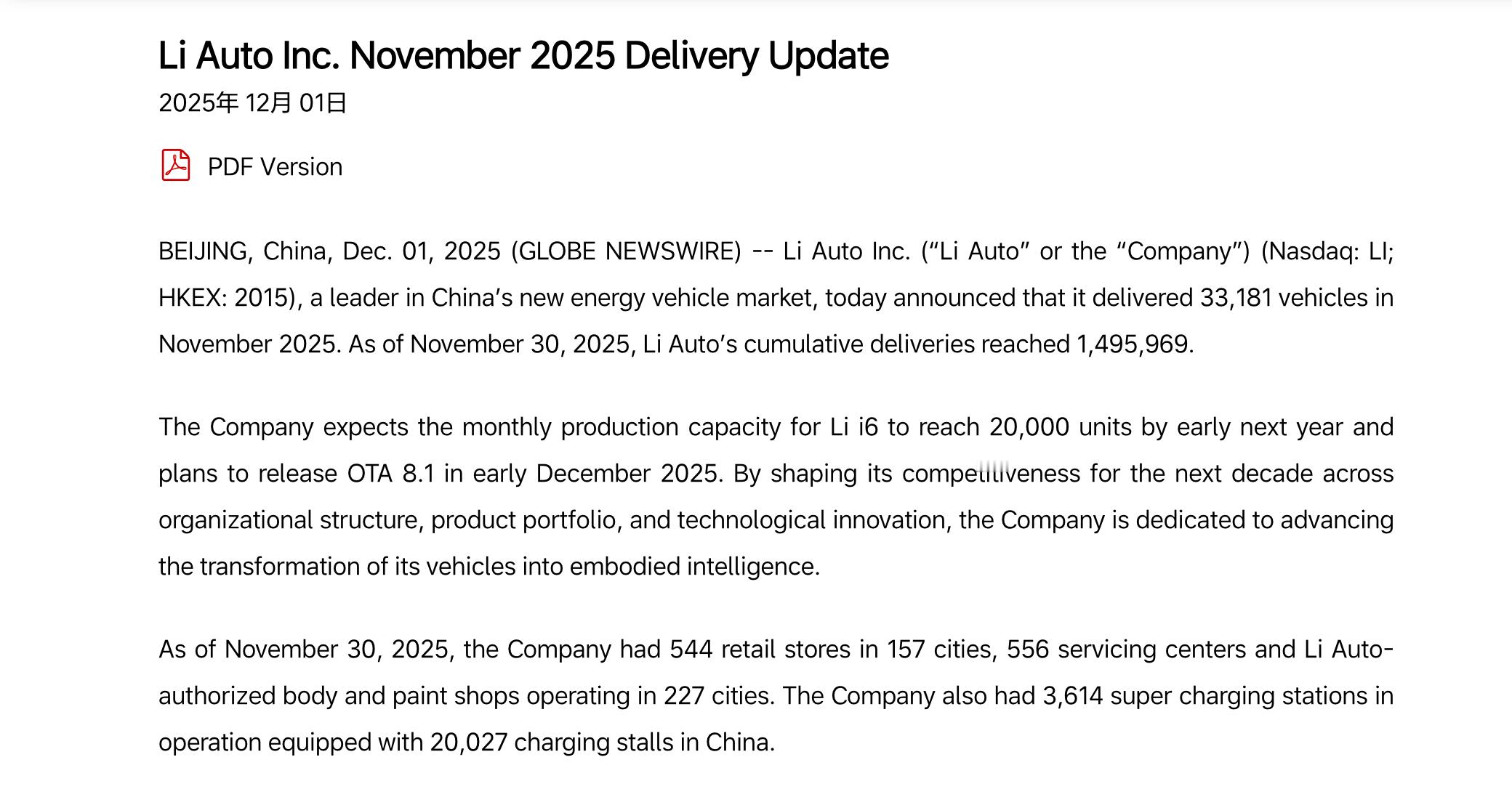 理想 11 月交付量 33,181 辆,2025 年累计交付量 369,108 辆。理想 i6 和理想 i8 累计订单突破 10 万辆,预计 26 年初 i6 产能将提升至 2 万辆/月。另外 OTA 8.1 将于 12 月初正式推送。新能源汽车