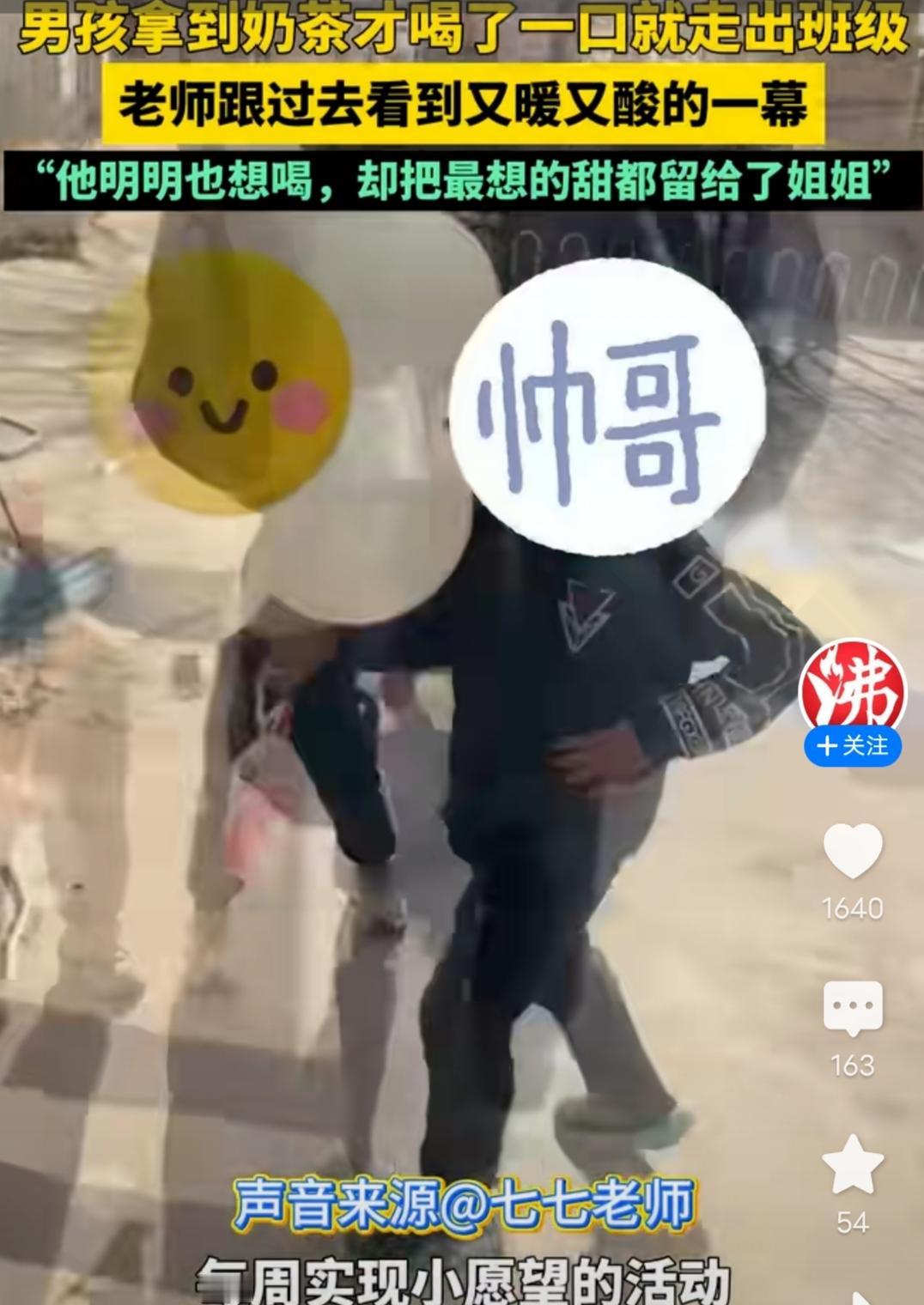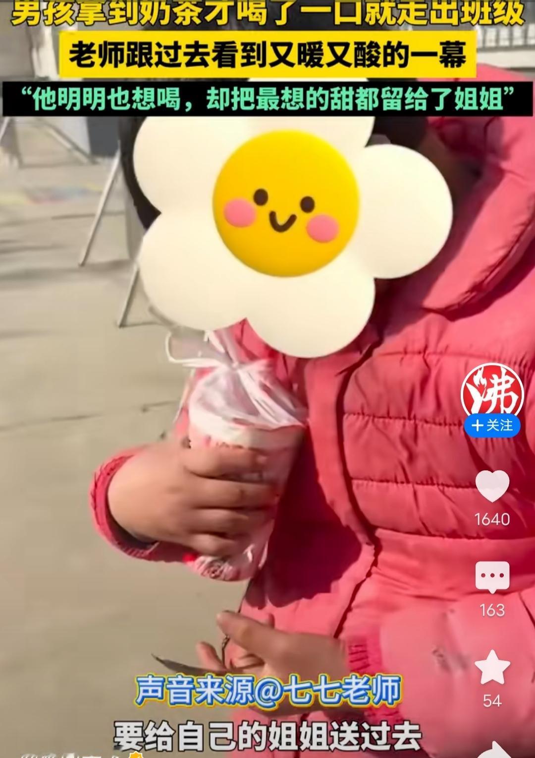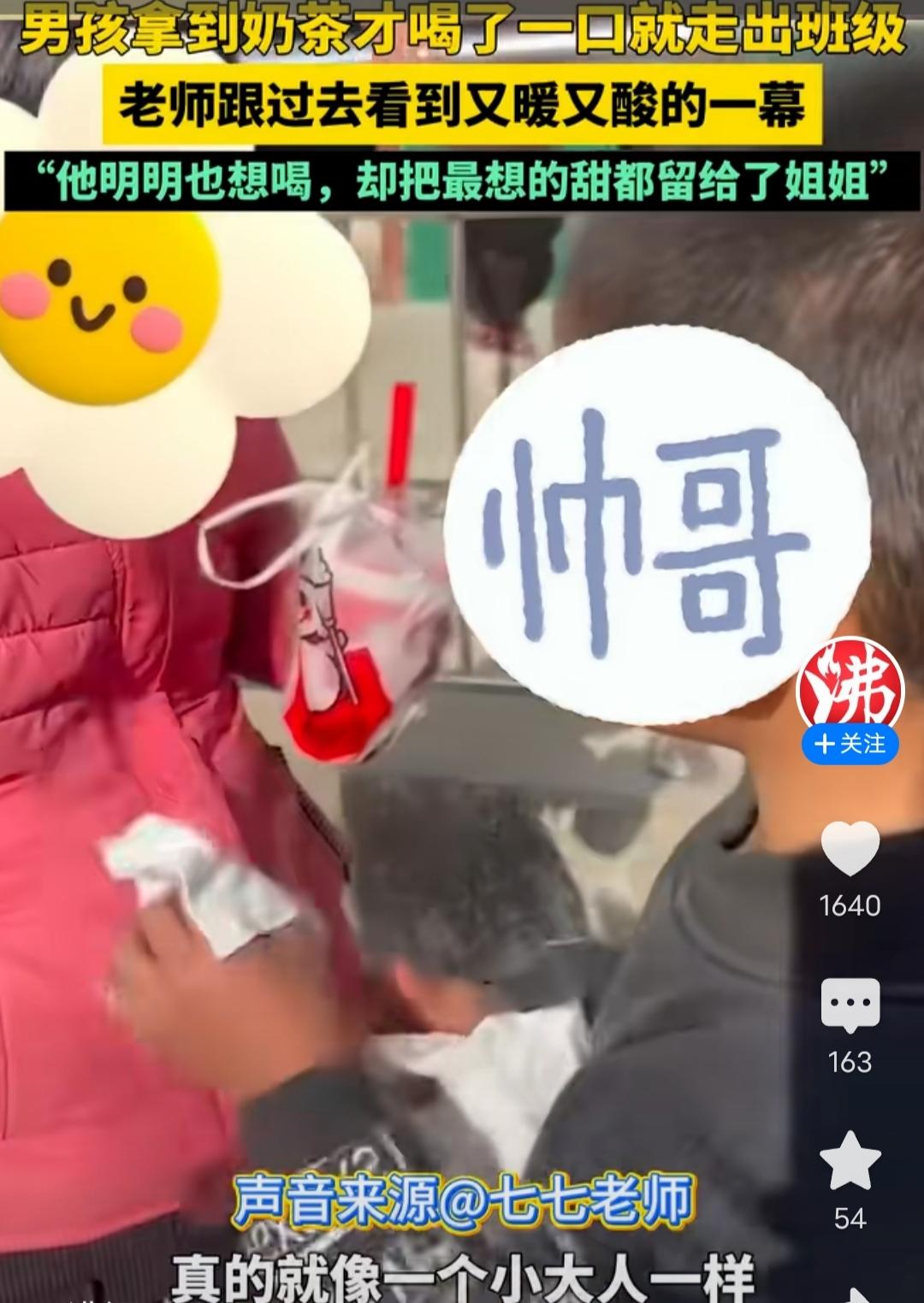 男孩拿到奶茶只喝了一口就走出班级,老师跟去一看很心酸! 我这是在沸闻天下看到的这个报道,近日在河南,一个班主任老师在班里设立了一个每周实现小愿望的激励活动,一个八九岁的男孩子,获得了一杯奶茶,他拿到奶茶的时候,自己就喝了一口,然后就走出了班级,老师好奇就跟着去看了,结果看到又甜又酸的一幕,男孩子把奶茶给姐姐喝了,虽然他自己也很想喝,但是他就喝了一口就给姐姐了,看到视频里他给姐姐擦鼻子,好多网友都破防了,说,看到这一幕就觉得亲手足是父母留给孩子最好的礼物。 真的是啊,才一个八九岁的孩子,却像个小大人一样,真的让人感动。 网友们都夸这个男孩子很棒,我也觉得,这就是二孩和独生子女的幸福的区别,还有,二孩其实对于孩子的性格教育还是有影响的,独生子女大都是集万千宠爱于一身,所以他们会比较自我,更多的是首先想到的自己,而二孩可能就会更多地知道分享和爱他人。 这个小男孩长大一定是一个有担当的男子汉,好孩子一定会越来越好!