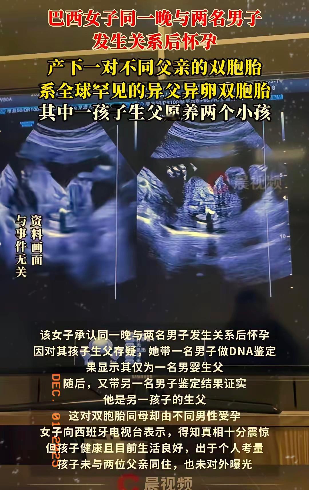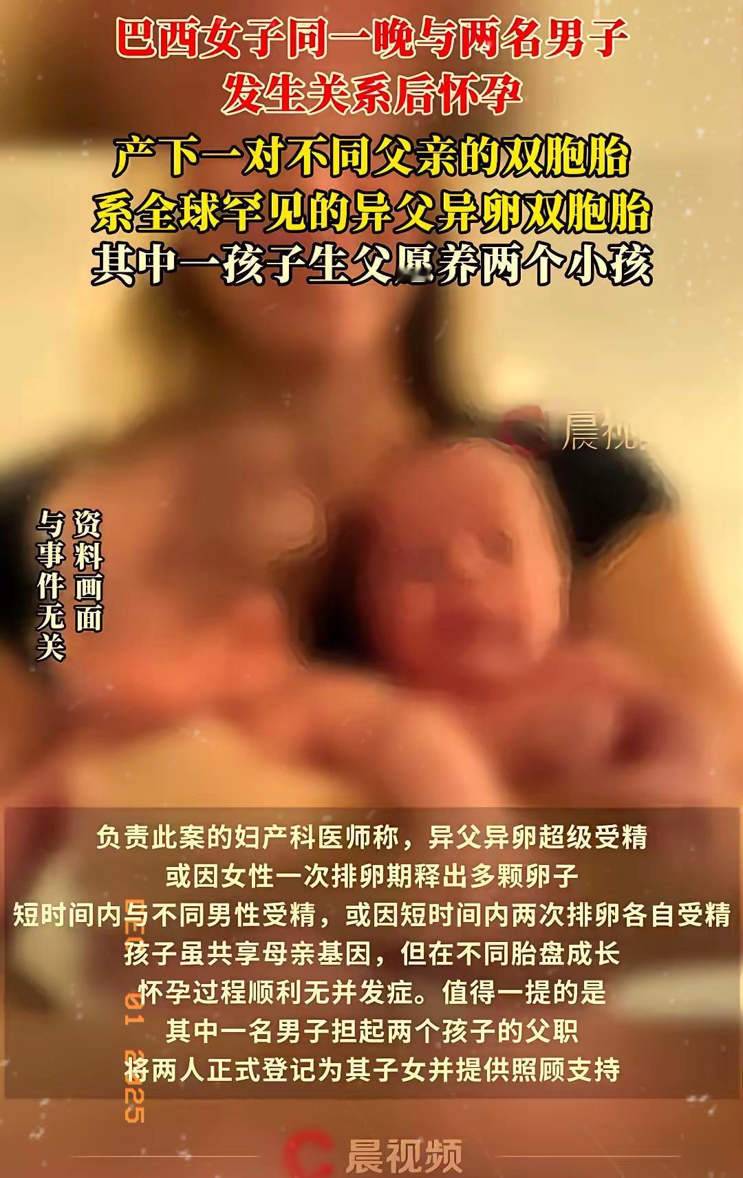 巴西一女子同一晚上和两名男子发生关系后怀孕,产下一对双胞胎,八个月后亲子鉴定时,竟发现两名孩子父亲不同,系全球罕见的异父同母双胞胎,其中一孩子生父愿养两个小孩。 这事儿听起来像电视剧桥段,可它真就发生在现实生活中。巴西这位妈妈最初是发现双胞胎儿子越长越不像,心里犯了嘀咕才去做鉴定。结果一出,她自己都惊呆了,没想到一夜之间两个孩子的父亲竟是不同的男人。 这种奇迹发生的条件,比中头彩还苛刻。 医学上把这叫作“异父超受孕”或“异父异卵超受精”。它不是随意就能发生的,需要几个极端巧合同时碰上: 排出多卵:女性在单一排卵期罕见地释放出两颗或以上的卵子。 极短时间:在卵子存活的大约24-48小时内,与不同的男性发生关系。 分别受精:来自不同男性的精子,成功地分别让不同的卵子受精。 正因为条件如此苛刻,全球像这样被正式记录下来的案例,屈指可数,大约只有20例。负责此案的医生确认,巴西这个案例就是全球第20起。 你可能觉得这离我们很远,但类似的极低概率事件并非国外独有。就在今年初,上海也有一个经过司法鉴定的案例。一对夫妻通过试管婴儿技术得到了双胞胎,结果上户口做亲子鉴定时发现,父亲只和其中一个孩子有生物学关系。调查后发现,妻子在植入胚胎期间曾与另一名男性发生关系,导致自然受精和人工受精的胚胎同时着床。可见,虽然罕见到百万分之一,但科学原理决定了它有可能发生。 说回巴西这个家庭,事情曝光后,最触动人的不是罕见的生物学现象,而是其中一位当事人的选择。两位生父都没有和孩子住在一起,但其中一位站了出来,做了一件非常温暖的事:他不仅认了自己的亲骨肉,还决定把另一个孩子也正式登记为自己的儿子,承诺提供抚养和支持。这个决定让原本可能充满纠葛的故事,有了一个充满担当的走向。 网友们围观这个“奇闻”时,除了感慨世界之大无奇不有,也有很多声音夸赞这位父亲的胸怀。有人说,“血缘只是生物纽带,责任与担当才是家庭的基石”。这话点出了事件背后更深层的意义:家庭的定义,有时候可以超越纯粹的生物学联系。 医学的奇迹让我们看到人体和生命的复杂性与偶然性,而人性中的善意与责任,则让我们看到如何将一场意外,稳妥地安放进真实的生活里。这位母亲现在最欣慰的,就是两个孩子都在健康快乐地成长。 各位读者你们怎么看?欢迎在评论区讨论。
