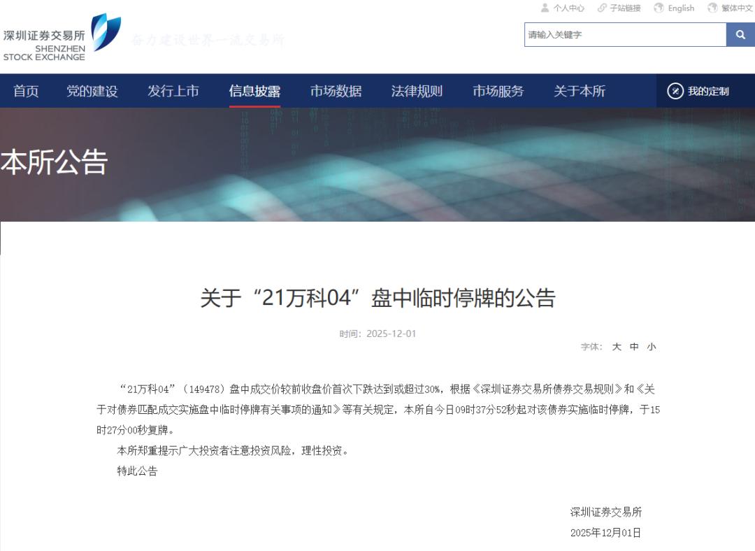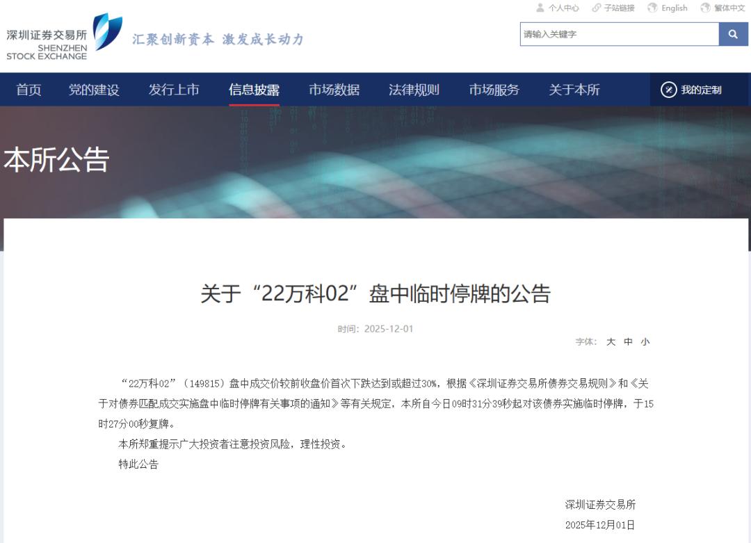 12月1日,万科境内债集体暴跌,截至收盘,21万科04跌45%,21万科06跌39%,22万科02跌38%,21万科02跌20%,23万科01跌17%。