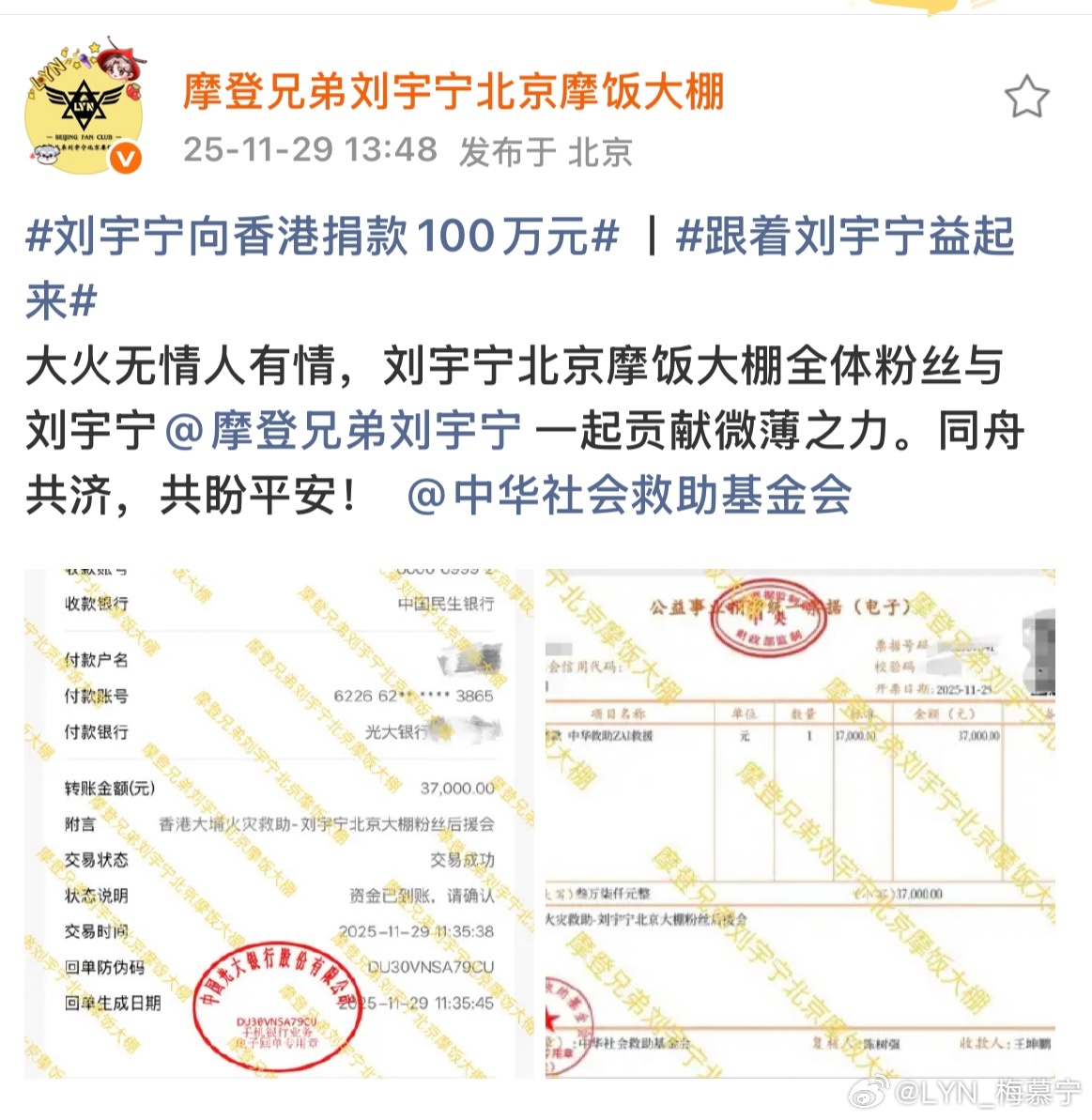 凝聚V力量 | 摩登兄弟 传递正能量 | 摩登兄弟公益行 有刘宇宁这样的正能量偶像做榜样,他的粉丝也不甘落后,刘宇宁北京摩饭大棚昨天也紧随偶像之后向香港火灾受难者捐出自己的爱心。大爱无疆 ❤️ 祈愿平安跟着刘宇宁益起来 | 刘宇宁向香港捐款100万元 | 刘宇宁