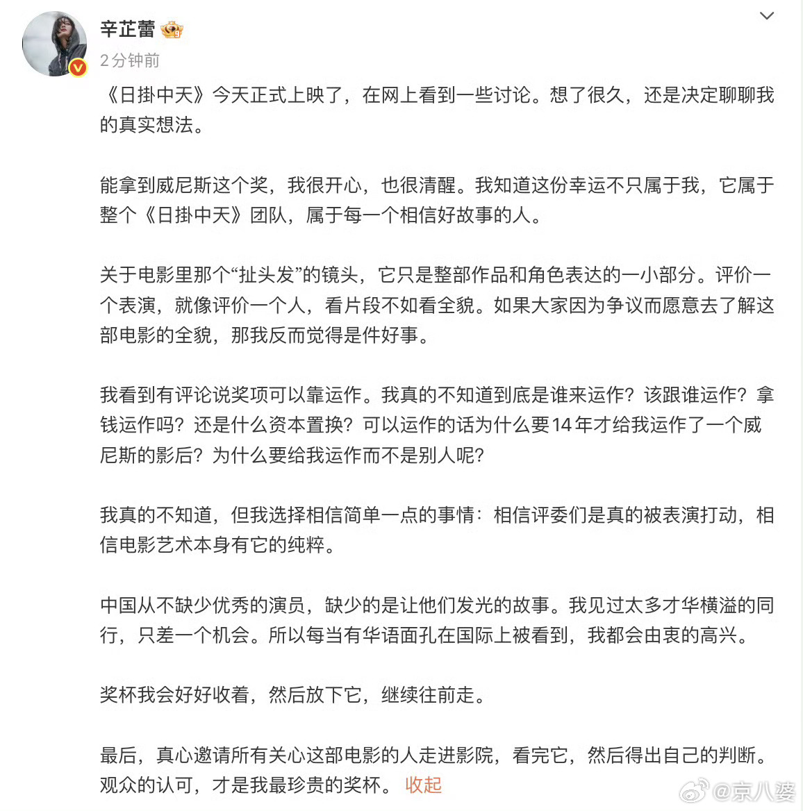 郝蕾 我说的不是辛芷蕾 这事儿竟然还有后续...郝蕾针对pyq事件回应说:“关于辛芷蕾这个问题是一个巨大的乌龙,而且在事发当天我们两个已经沟通的很好了。我说的压根就不是她。”既然俩人当天沟通好了,辛芷蕾为啥会发回应长文呢?