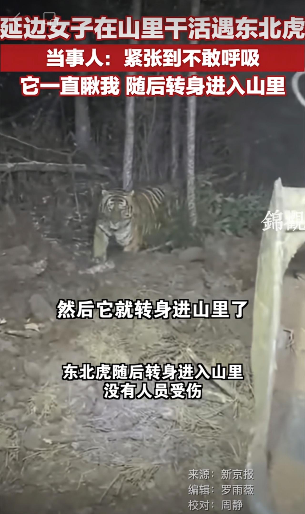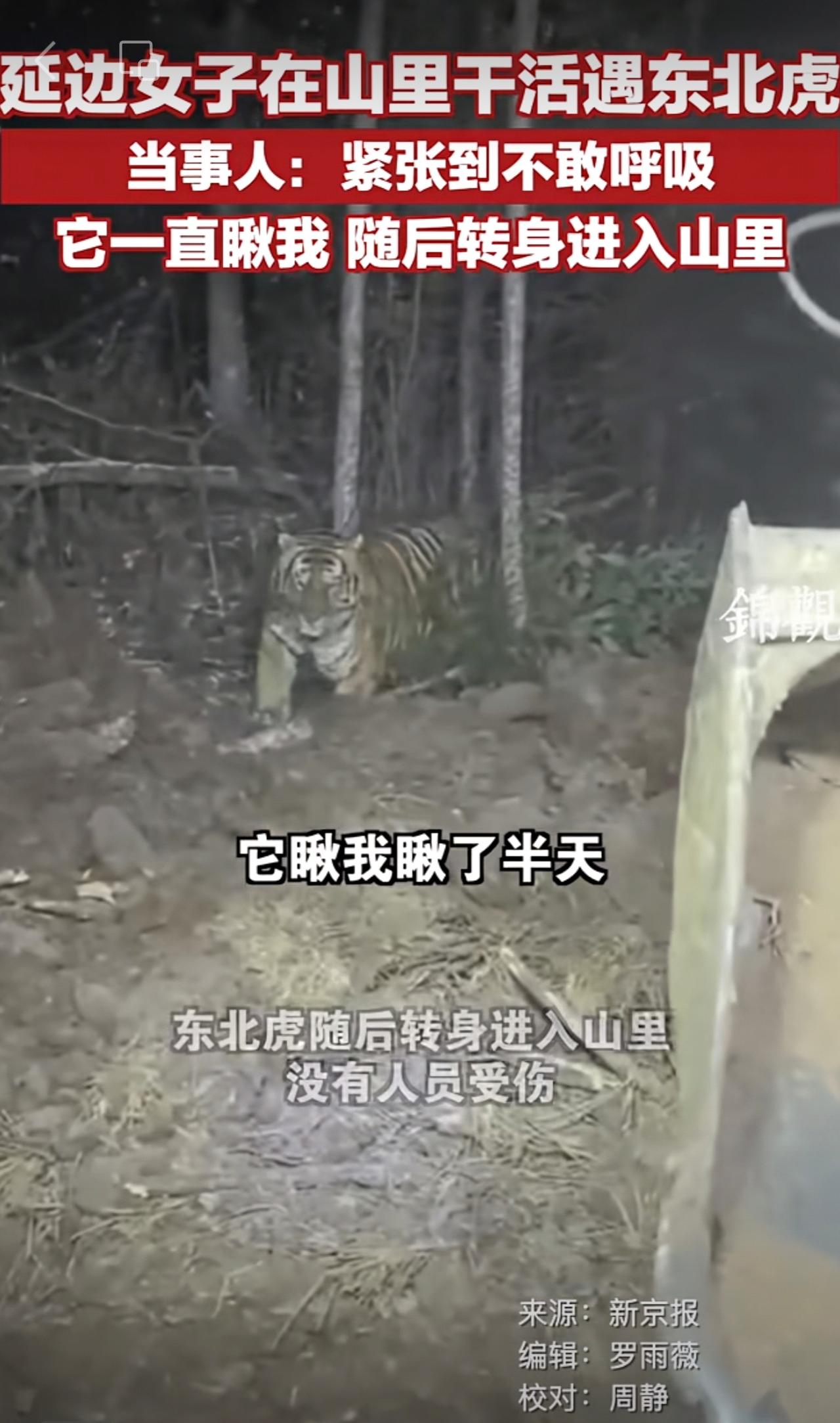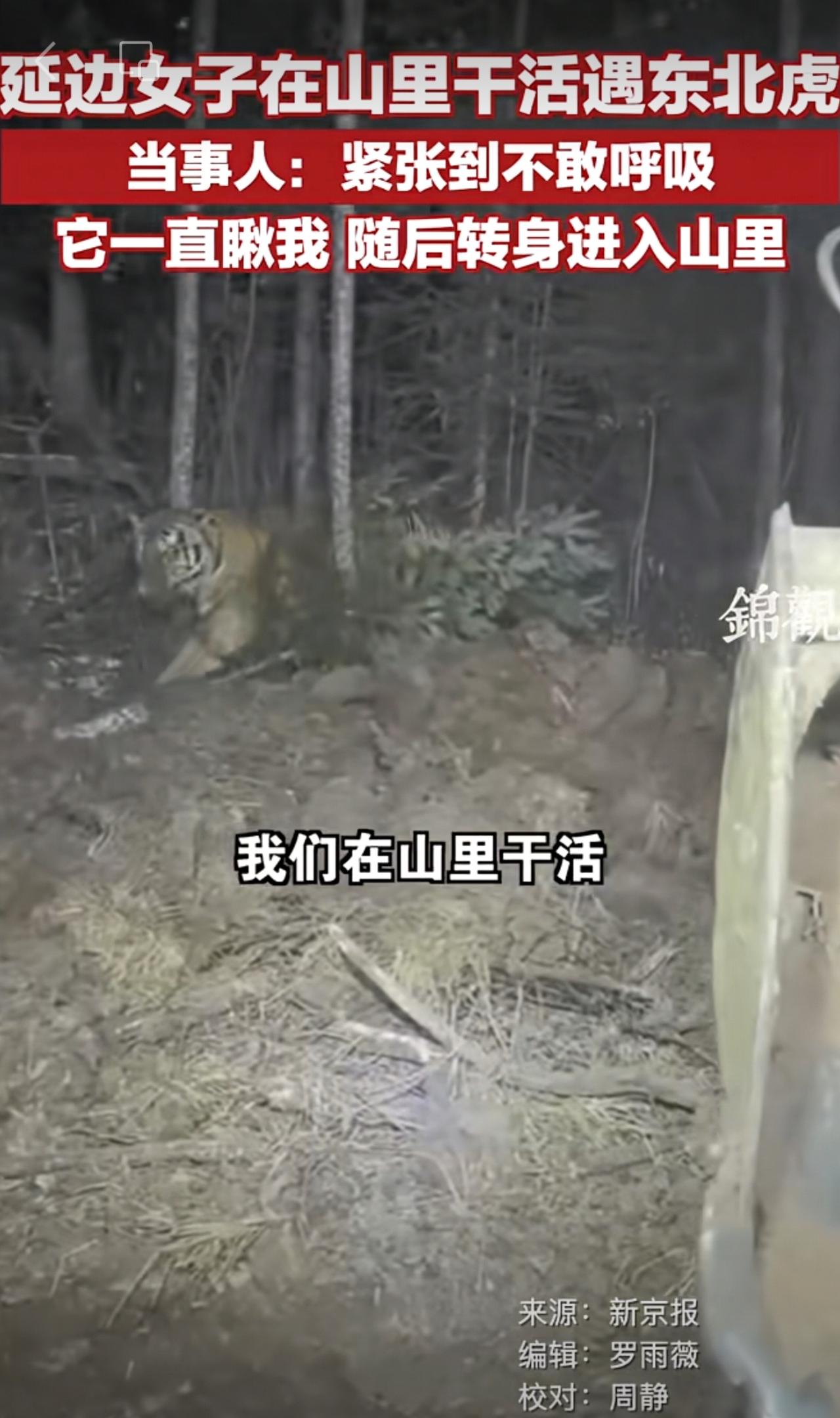 延边女子在山里干活遇东北虎,当事人:紧张到不敢呼吸 ,它一直瞅我,随后转身进入山里 。 网友:东北虎也怕母老虎的[呲牙][呲牙]更多资讯请关注 @锦观新闻