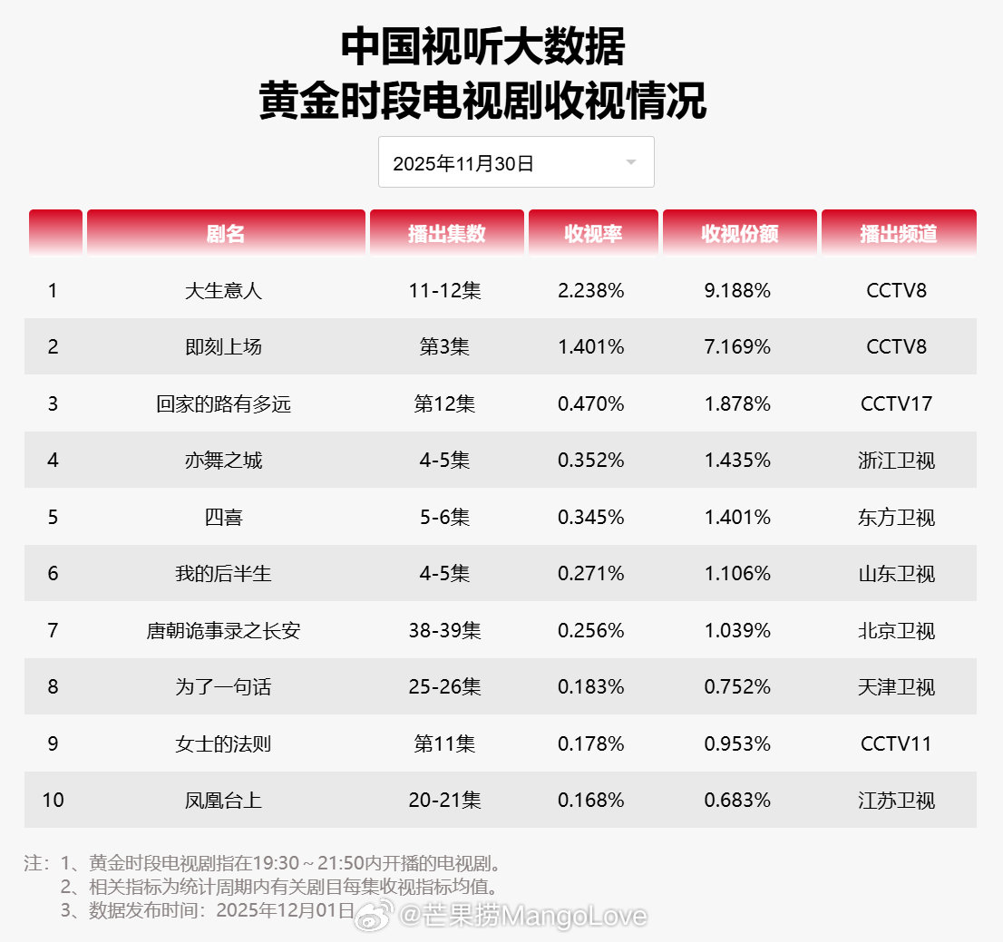 【2025年11月30日中国视听大数据CVB黄金档电视剧收视率日榜TOP10】1 大生意人 CCTV82 即刻上场 CCTV83 回家的路有多远 CCTV174 亦舞之城 浙江卫视5 四喜 东方卫视6 我的后半生 山东卫视7 唐朝诡事录之长安 北京卫视8 为了一句话 天津卫视9 女士的法则 CCTV1110 凤凰台上 江苏卫视