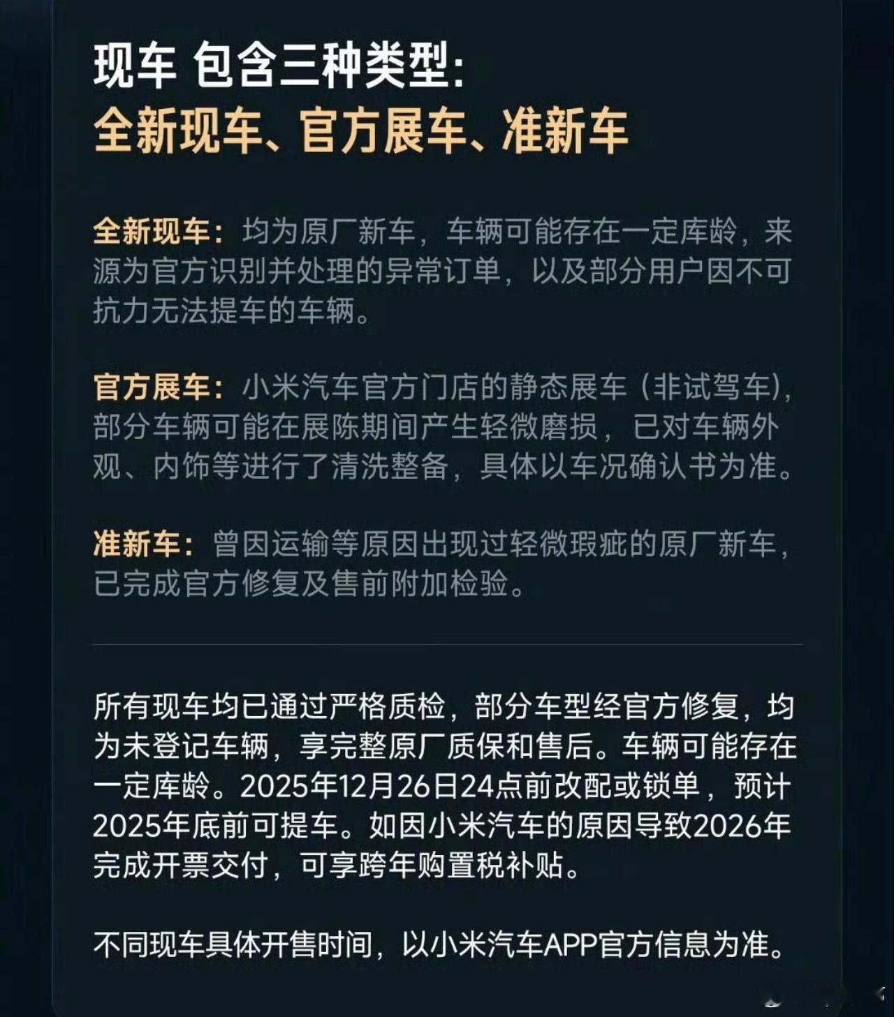 雷军回应现车选购即将开启对于着急提车的用户这还是不错的;而且这次雷军也标准了全新车、官方展车、准新车的来源情况,那么锁单的用户会选择现车吗?
