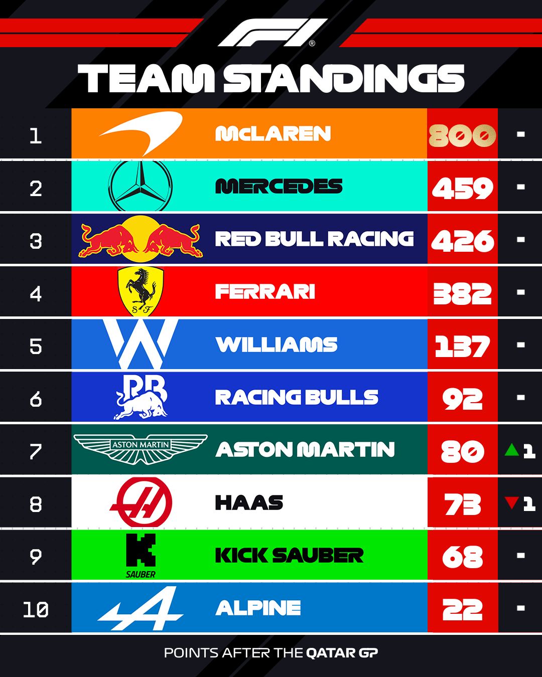 法拉利应该也锁定第四了吧,382+25+18=425超不过红牛了