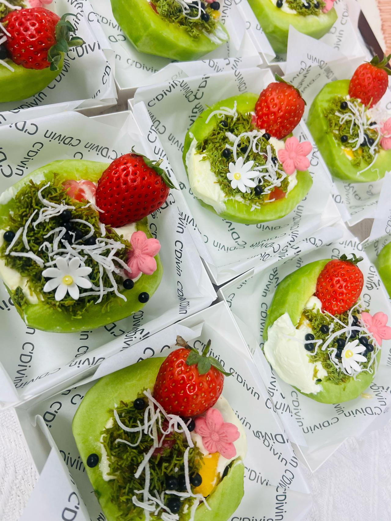 这两天刷到个超会整活的甜品,直接给我看饿了——这哪是吃的啊,分明是把春天装在哈密瓜里了! 你看这青悠悠的哈密瓜当容器,里头裹满奶油和水果,顶上撒点“小绿草”,再戳朵小雏菊、摆颗红草莓,活脱脱像把花园搬进来了。 朋友圈刷到的时候,我第一反应是“这能好吃吗”,结果评论区全是打卡的:“咬一口又甜又清爽,哈密瓜的脆裹着奶油的软,直接给夏天降了温!” 现在的甜品真会拿捏少女心,连打包纸都印着花体字,摆一桌跟小花园似的,拍照发圈能被问爆链接。