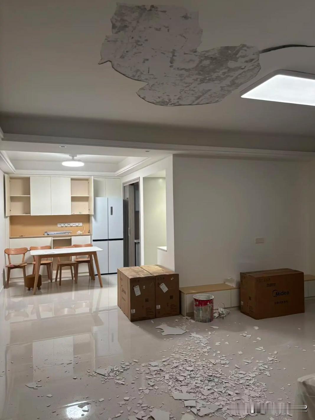 两个月不到天花板脱落,到处开裂!太危险了! 今年9月底刮的腻子,10月初刷的乳胶漆,都是立邦的,前几天回家准备装空调就发现天花板掉下来了,而且到处开裂。 老房子新装修,为了防止甲醛一直开着窗户通风,几乎没有下雨天都是晴天,为什么会脱落啊,而且才一个多月就掉下来了,还好家里没人不然砸到人更麻烦,现在家具电器都进了,修补起来更加麻烦,有人知道什么原因以及可以怎么修复吗? 现在发现顶板上很多涂料层都开裂了,都把它圈了出来,找不到原因而且担心其他地方也会接着掉,新家不敢住了怕被砸。