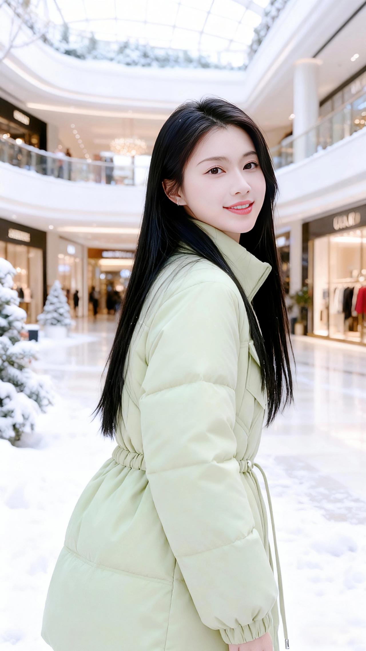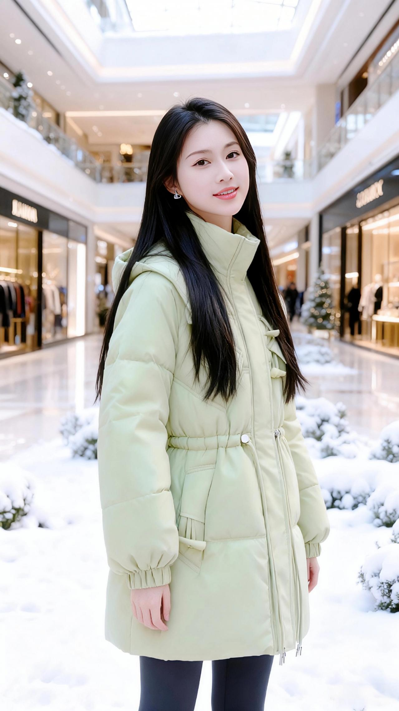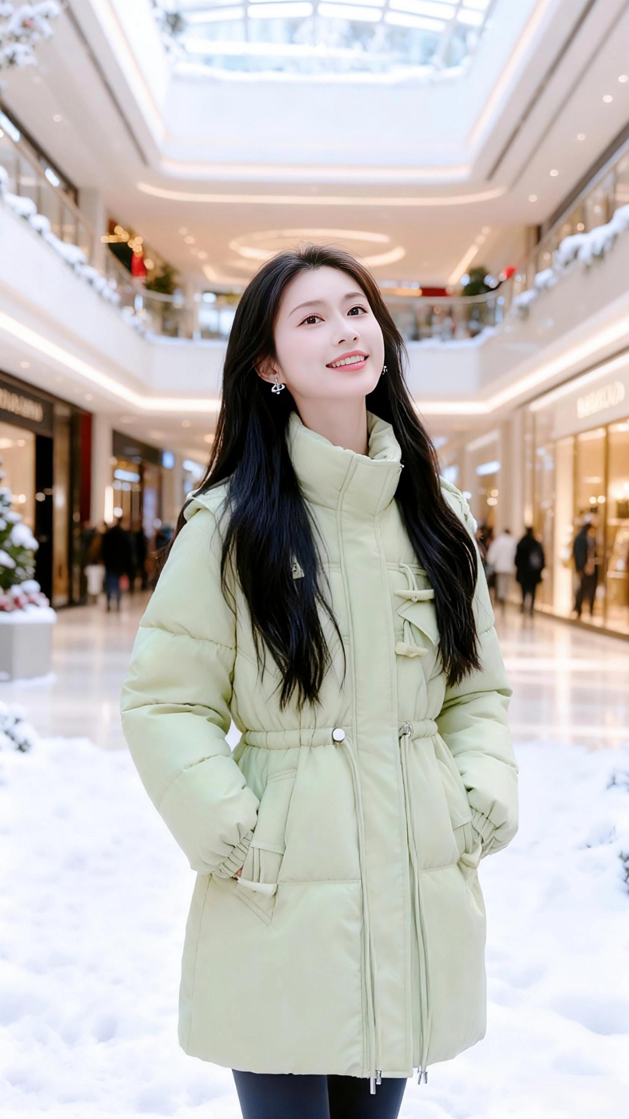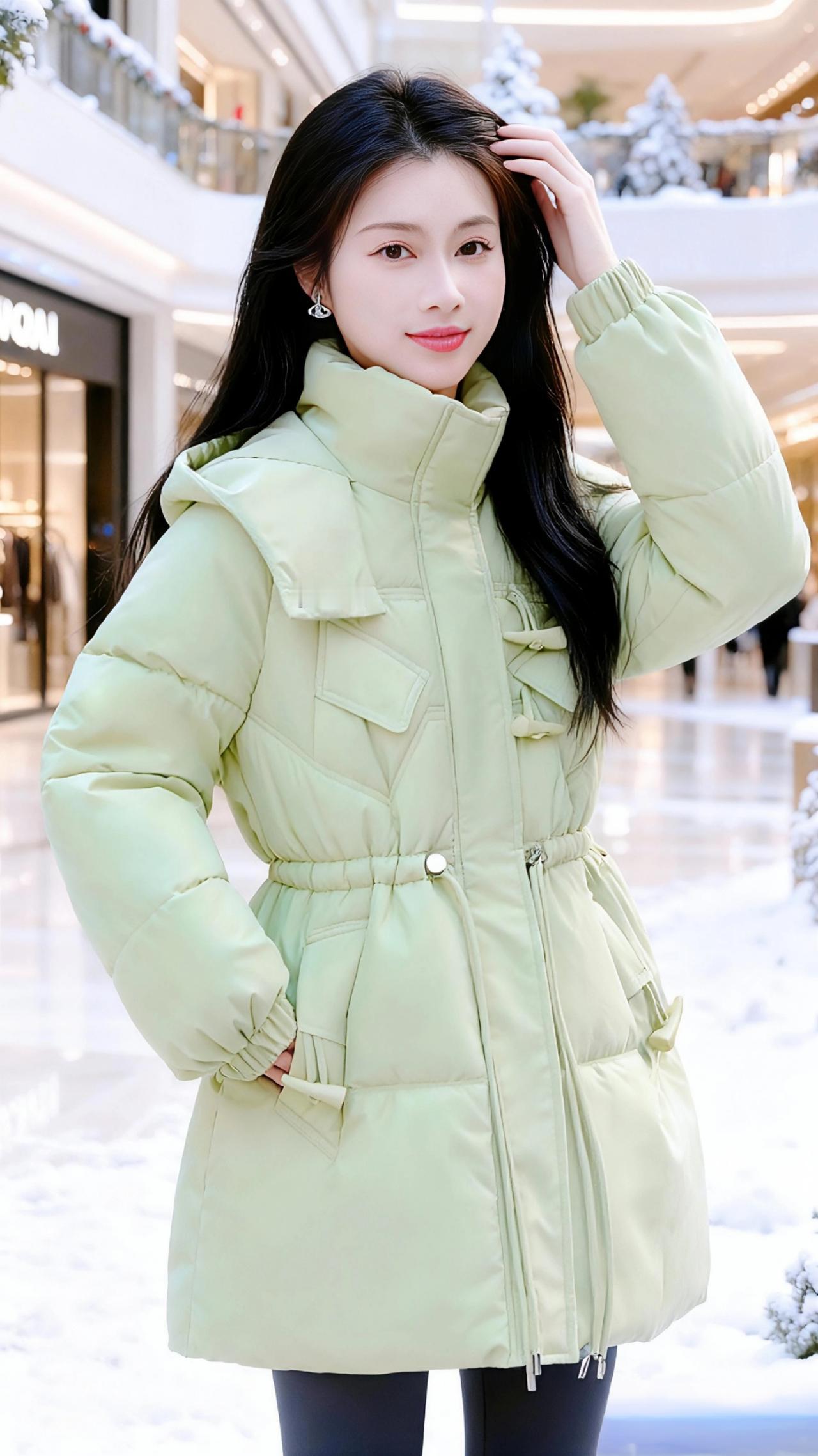 这抹浅春的绿,是冬日光芒里的意外温柔。 她裹着这件蓬松的衣,像裹了半捧未化的春雪——领口立着,把寒风滤成软绒绒的气,抽绳轻轻一收,便让臃肿的冬装也有了腰肢的弧度。牛角扣是俏皮的,像春枝上刚冒的芽,连袖口的褶皱都软得像云,兜住了零星的暖意。 商场的玻璃映着碎雪,她的发梢掠过衣摆,那抹淡绿便在冬的冷调里洇开,像把春天的第一缕风,先裁成了衣裳。连脚步都轻了,像是怕惊碎这衣褶里,藏着的半分春的胎动。 高级感穿搭 羽绒服穿搭 秋冬穿搭 小个子穿搭