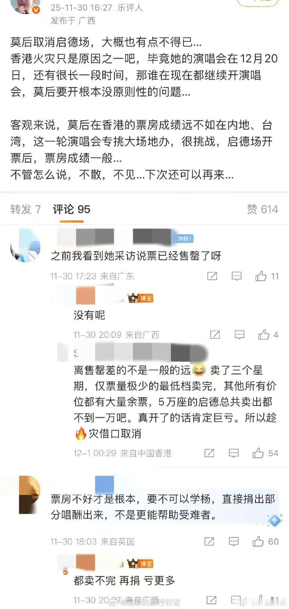 莫文蔚演唱会几万张票只卖了几千疑似莫文蔚取消香港演唱会的原因莫文蔚演唱会几万张票只卖了几千,她这轮演唱会,开场几十分钟把你能想到的热门歌搞了个大串烧,后面好多首都是冷门歌。感觉好多歌手已经沉浸在自己的“艺术”里面无法自拔,开演唱会还是得照顾一下路人感受吧