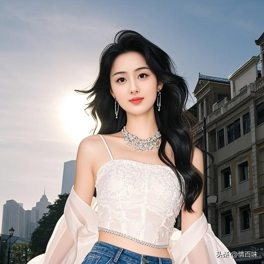 风华绝代的东方美女,绝美的脸蛋,AI妙生图 梦幻蓝裙少女,优雅珠宝闪耀,都市街头漫步。AI随心绘 高清美女 东方冷艳美人