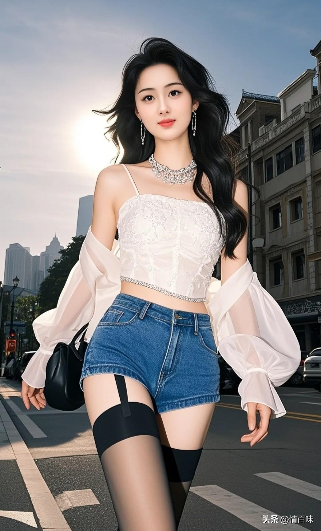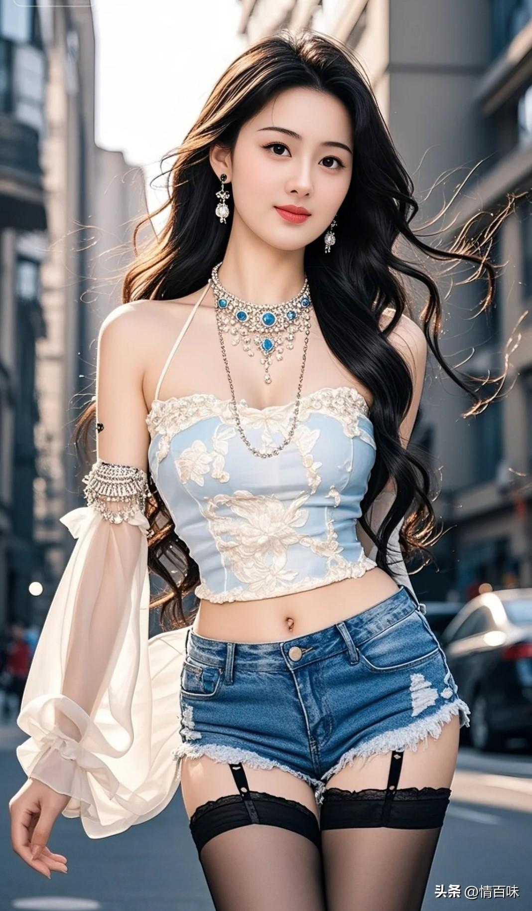 风华绝代的东方美女,绝美的脸蛋,AI妙生图梦幻蓝裙少女,优雅珠宝闪耀,都市街头