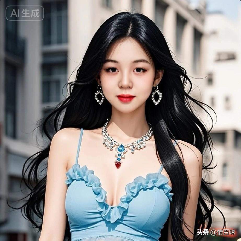 高清美女,带着我女朋友,夏天去游玩。她的优雅少女,蓝裙飘逸,珠宝闪耀。AI随心绘高清美女写真图 治愈系美女