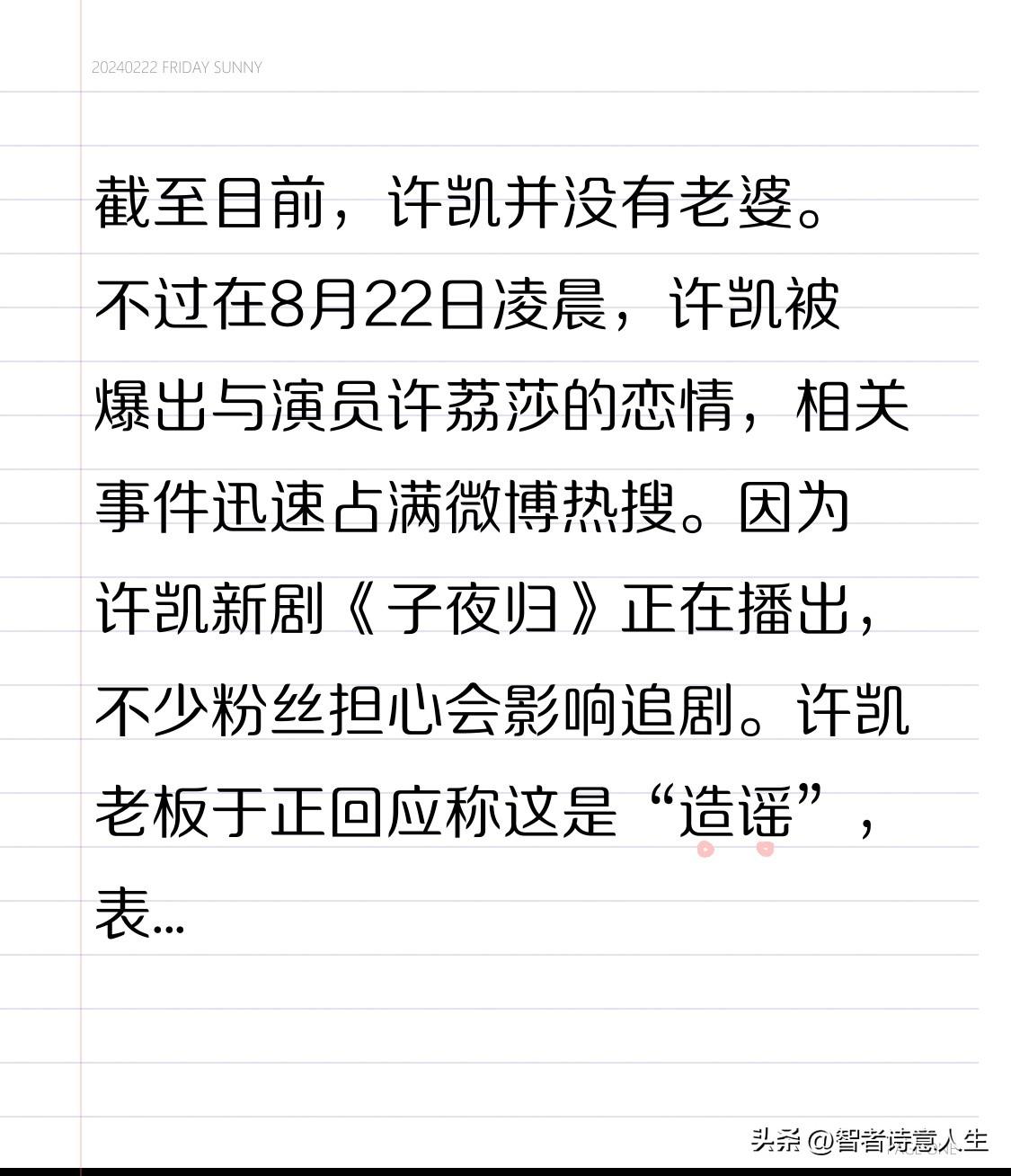 许凯并没有老婆。不过在8月22日凌晨,许凯被爆出与演员许荔莎的恋情,相关事件迅速占微博热搜。因为许凯新剧《子夜归》正在播出,不少粉丝担心会影响追剧。 许凯老板于正回应称这是“造谣”,表示许凯单身,两人21年拍戏有短暂交际,早已无联系,聊天记录均为伪造且已报警。但许荔莎强烈反驳,称自己以前是许凯女友,22年年底因赵晴开房被拍而分手,还发了多张许凯私密照片。许凯工作室也发文称是造谣并已报警。 许凯街拍造型 许凯秋日穿搭 明星 嘿嘿🤤🤤🤤🦀🦀