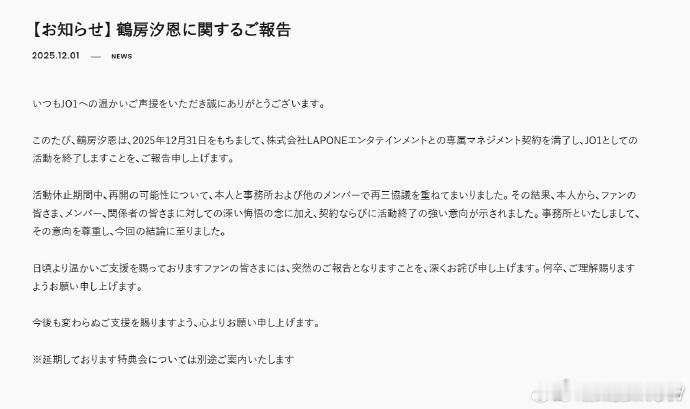鹤房汐恩退团退社 据日媒,JO1鹤房汐恩将于年底退团,同时退社。