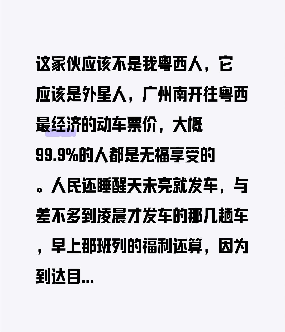 这刁毛多数不是咱粤西人,倒像是个外星人。 广州南开往粤西最实惠的动车票价,恐怕约99.9%的人都没机会享受。 发车时间要么是天还没亮,人们还在睡梦中,要么差不多到凌晨才发车的早晚那几趟。 对比之下,感觉早上那趟车还算有点福利,毕竟到达目的地时是白天。 但麻烦的是赶它早班列去南站,早上广州地铁是早上6多才为民服务的,想坐它早班列要么自己亲人开送你去赶动车,要么坐高价的士去赶它! 而将近凌晨发车的那趟就更惨了,到达家都是凌晨二三点了,想回到家要么得花高价坐的士,要么早早叫家人来接你,要么就得花一两百元去住酒店。 试问阳江、茂名、湛江的人又有多少会去坐呢?说白了,这所谓的优惠价根本没啥用!