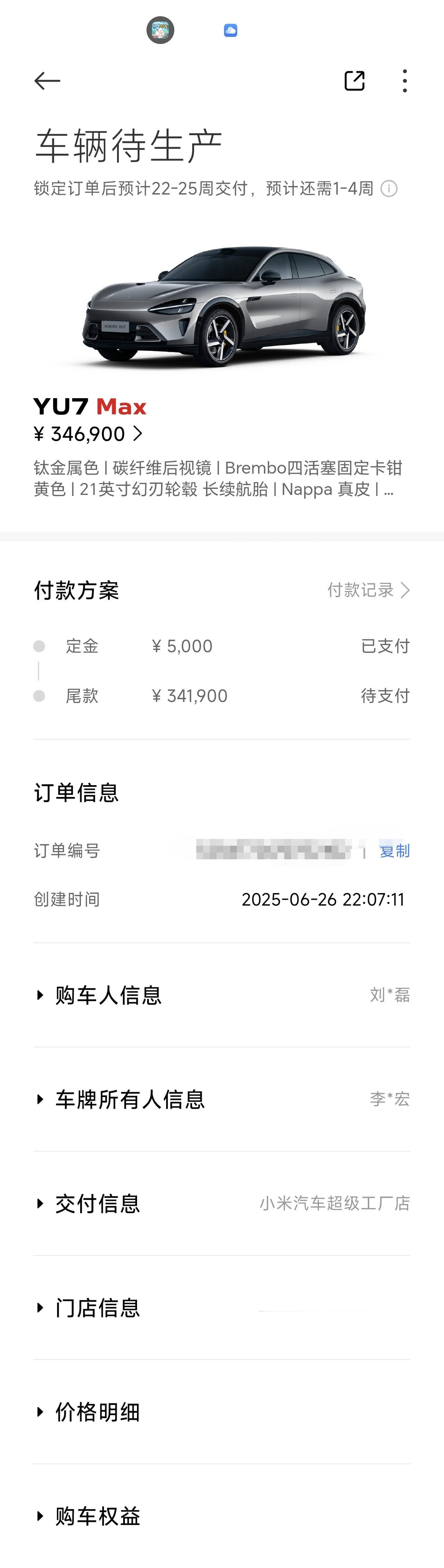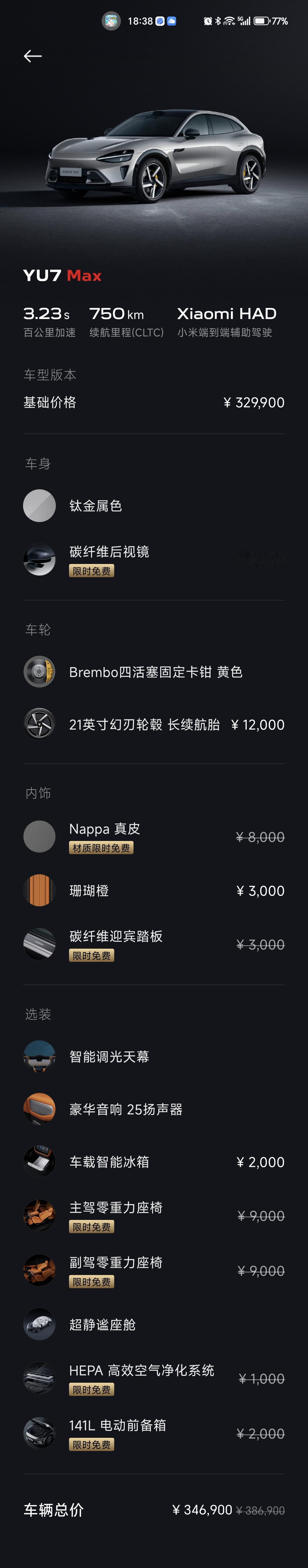小米YU7 MAX北京转单,直接更名一手车,发售日锁单,现车现车,再定等到2026年下半年,首发权益拉满,选配21寸幻刃轮毂+珊瑚橙内饰+冰箱,配置见图。